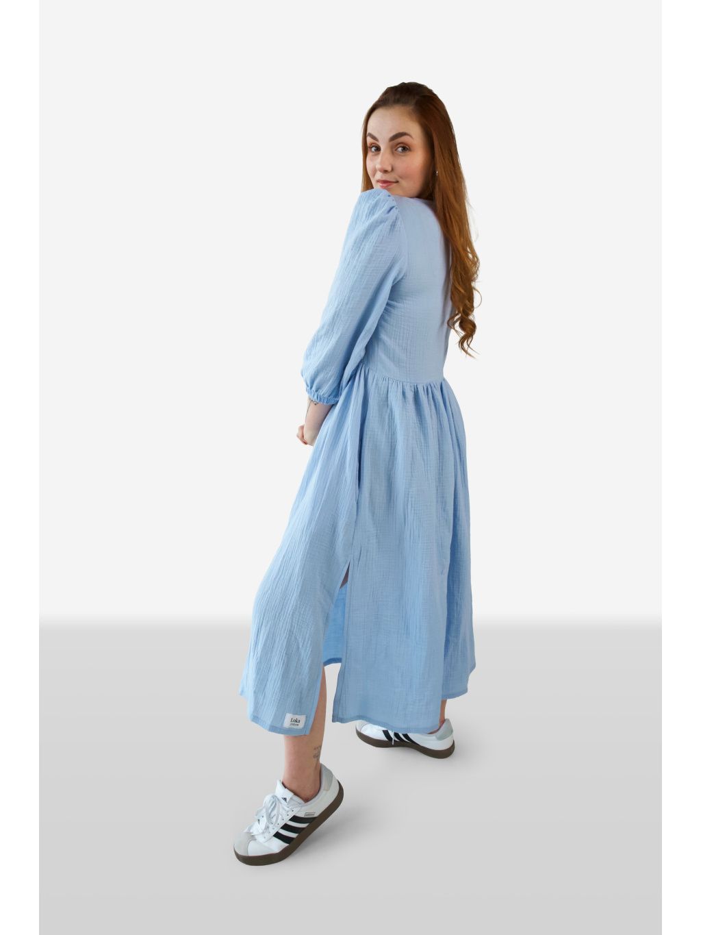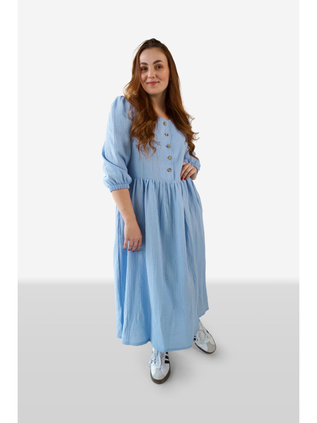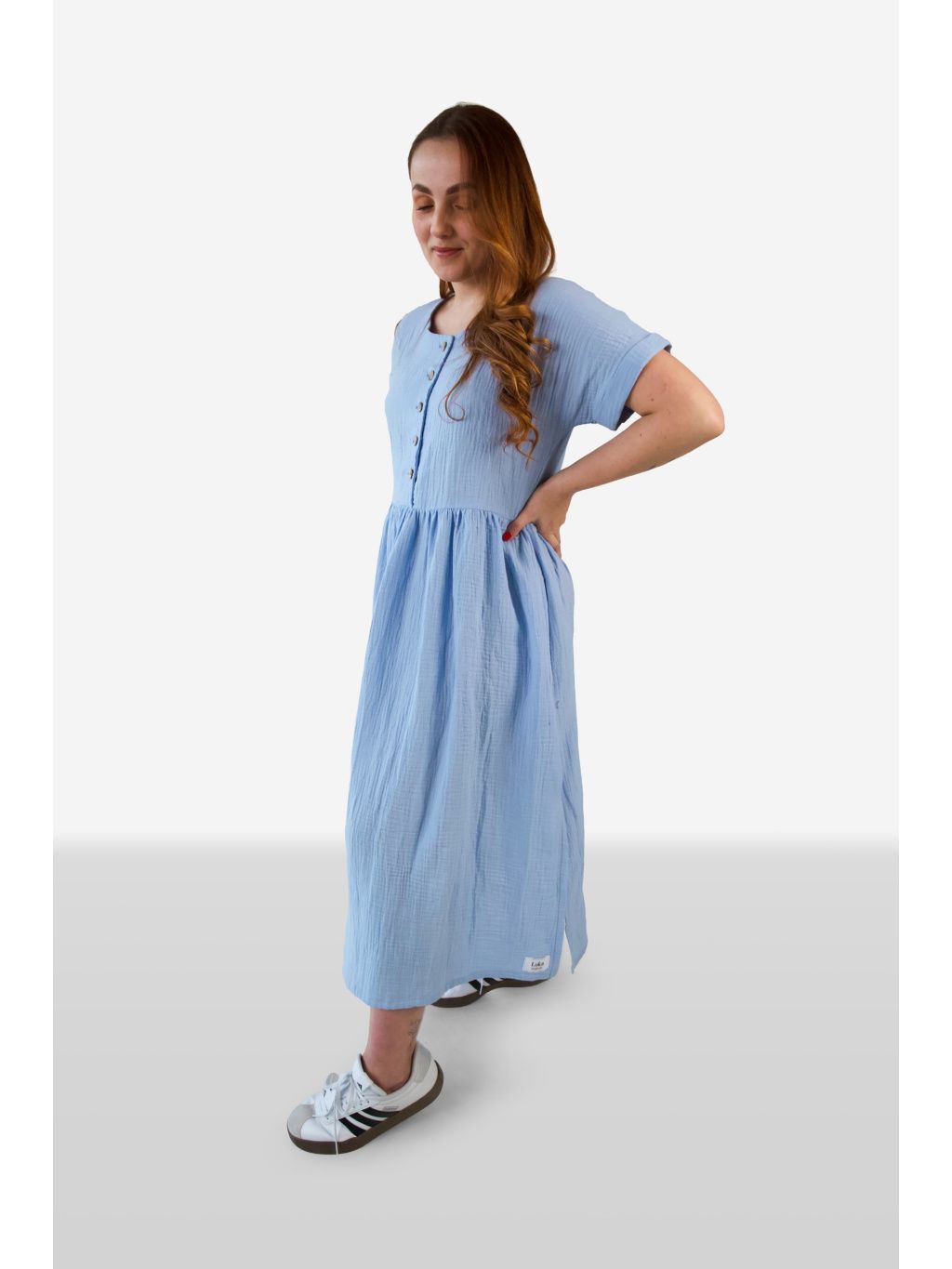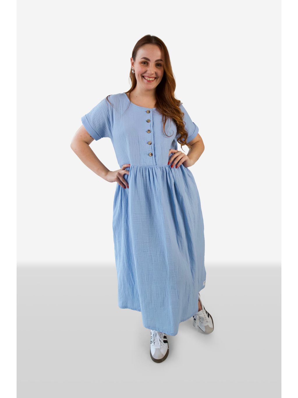 Jsou ušity z mušelínu, který je lehký, prodyšný a velmi příjemný na nošení. Díky pohodlnému střihu jsou ideální pro každodenní nošení. Na straně šatů najdete rozparek, který zajišťuje větší volnost při chůzi. Nezapomněli jsme ani na oblíbené kapsy.