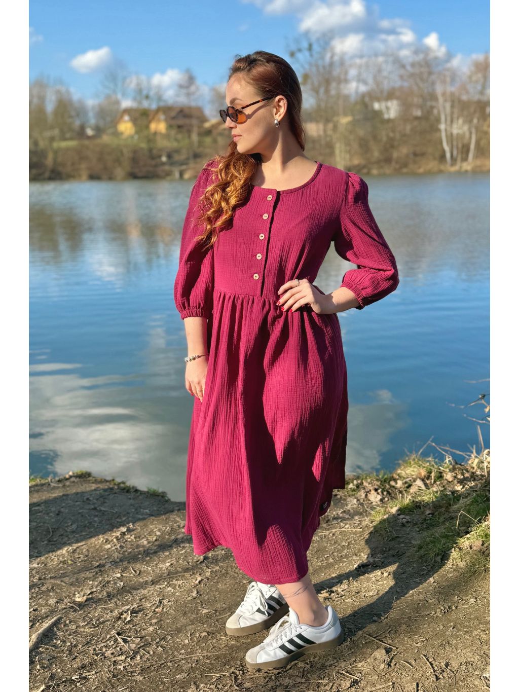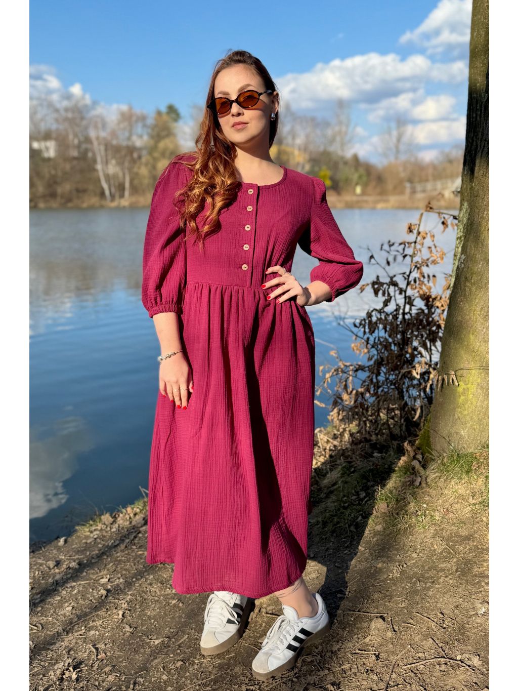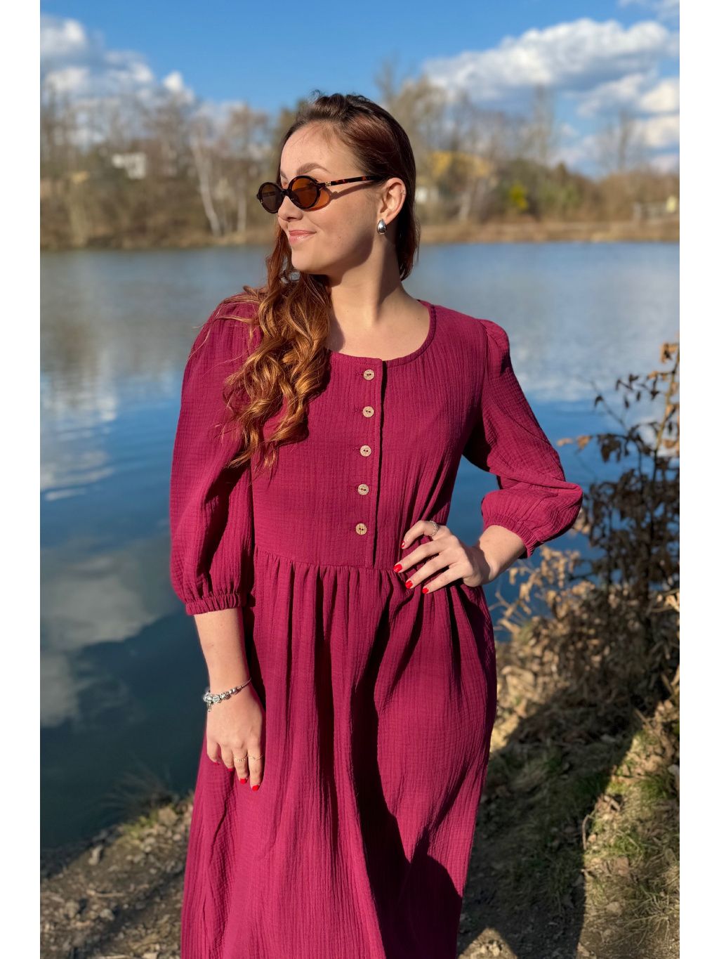 Jsou ušity z mušelínu, který je lehký, prodyšný a velmi příjemný na nošení. Díky pohodlnému střihu jsou ideální pro každodenní nošení. Na straně šatů najdete rozparek, který zajišťuje větší volnost při chůzi. Nezapomněli jsme ani na oblíbené kapsy.