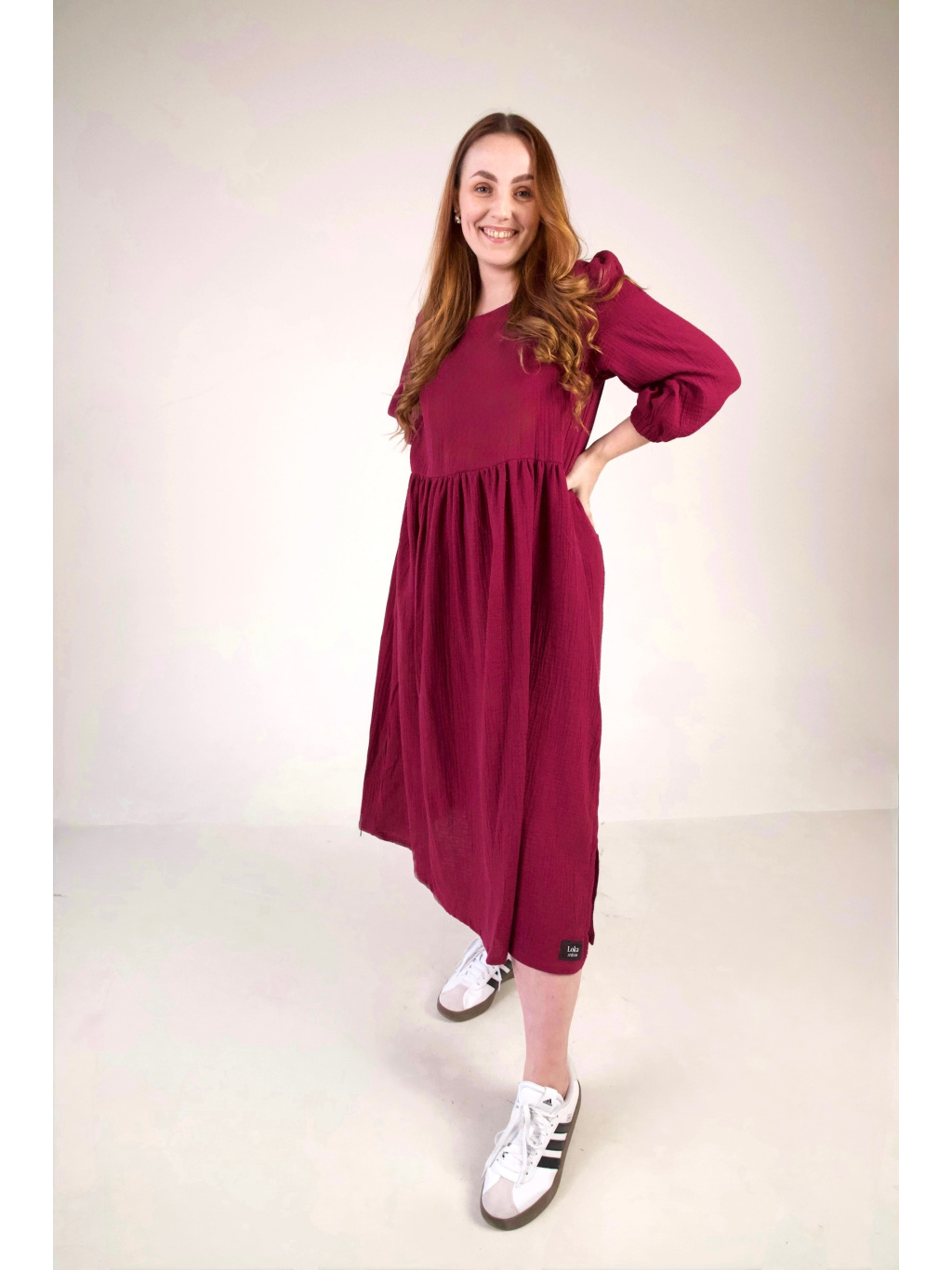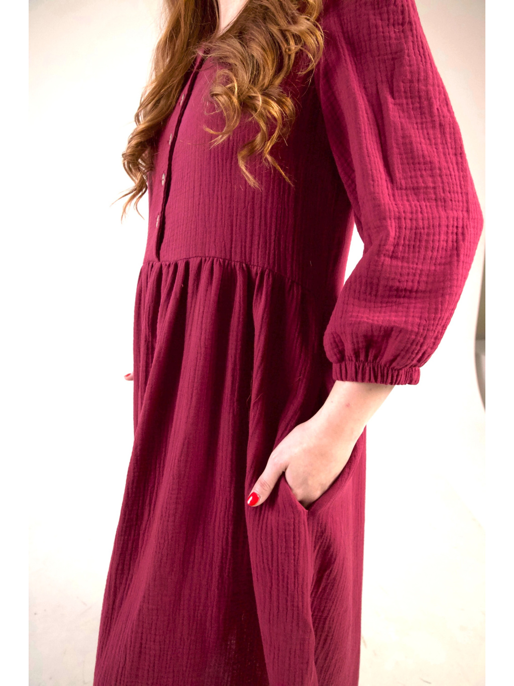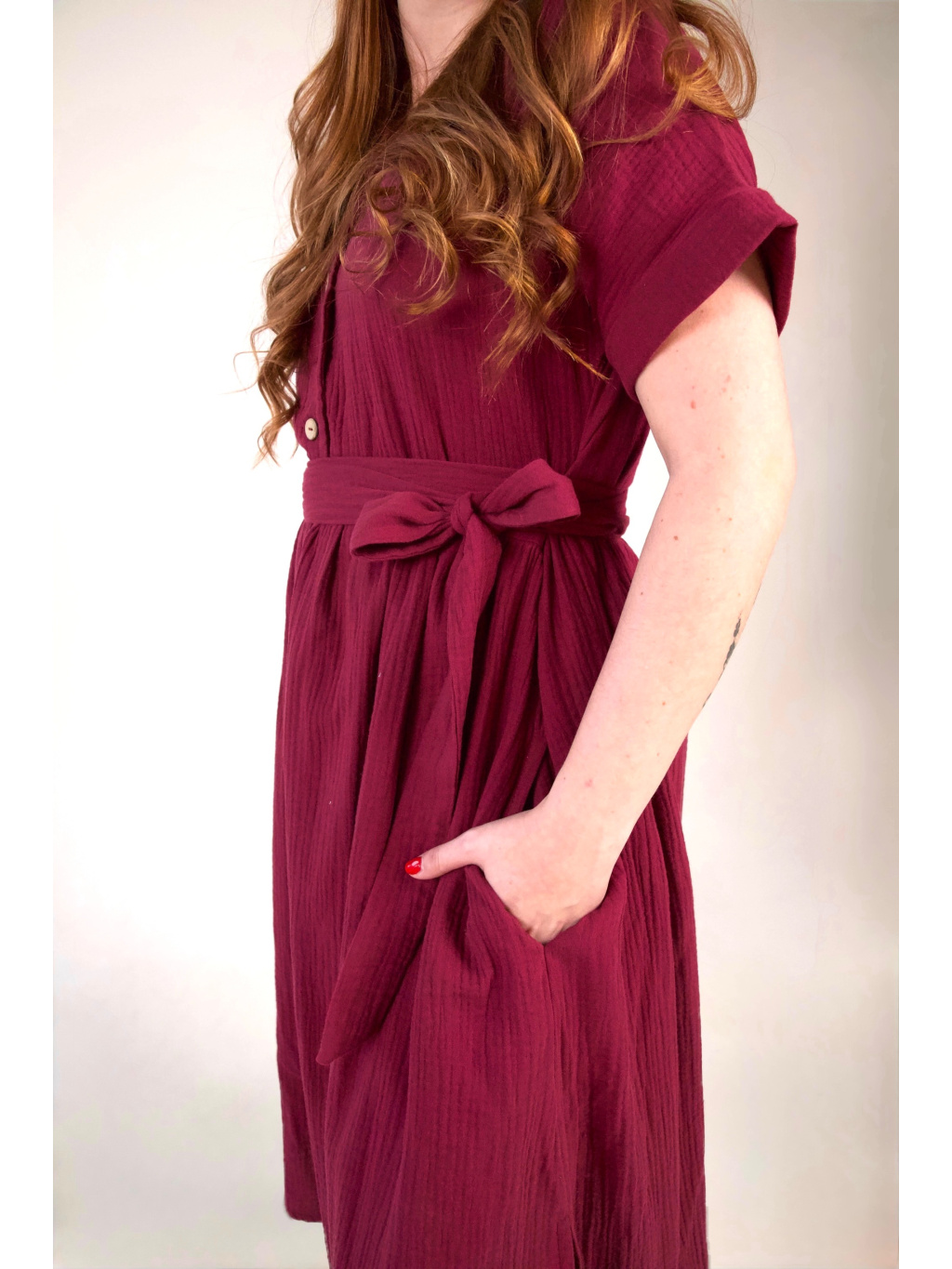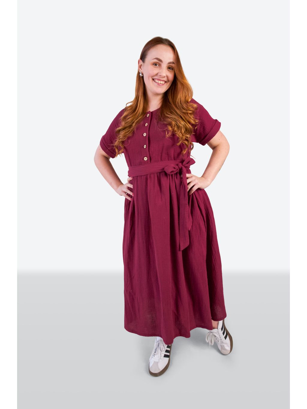 Jsou ušity z mušelínu, který je lehký, prodyšný a velmi příjemný na nošení. Díky pohodlnému střihu jsou ideální pro každodenní nošení. Na straně šatů najdete rozparek, který zajišťuje větší volnost při chůzi. Nezapomněli jsme ani na oblíbené kapsy.