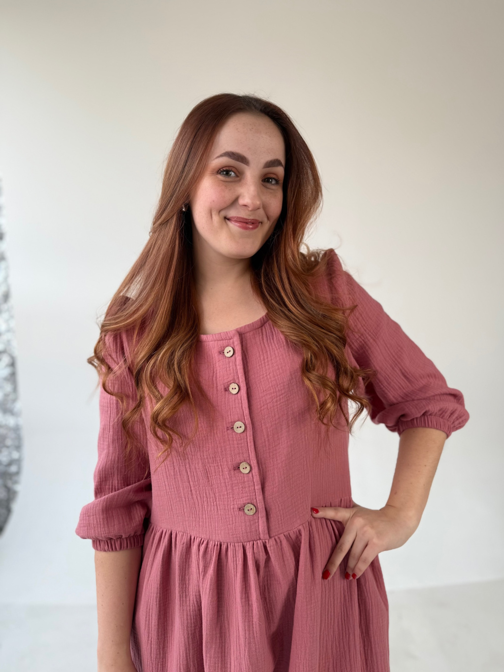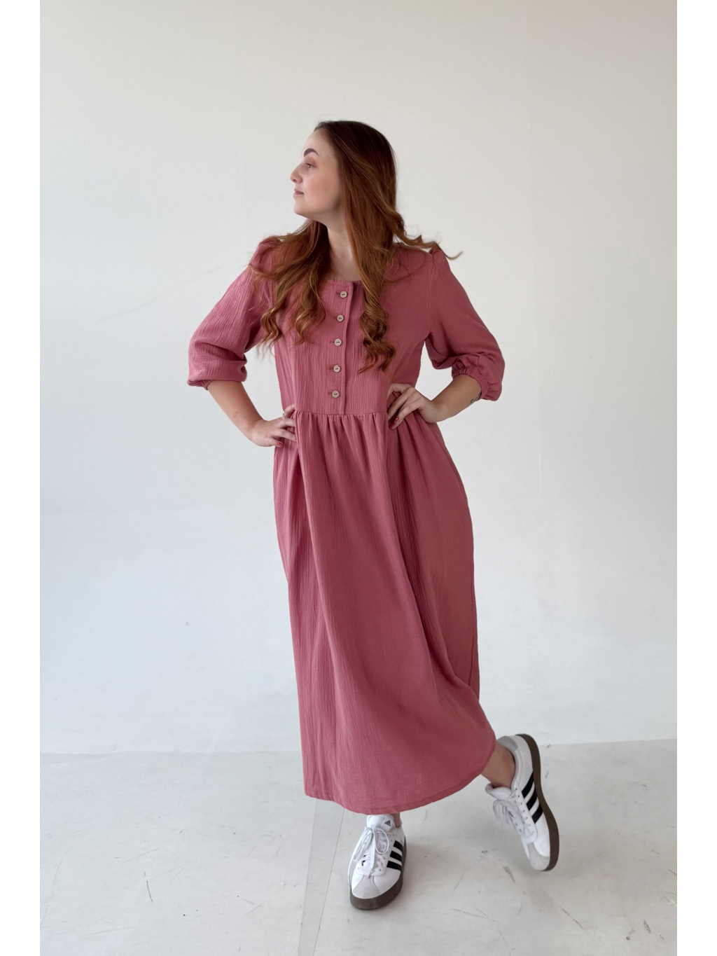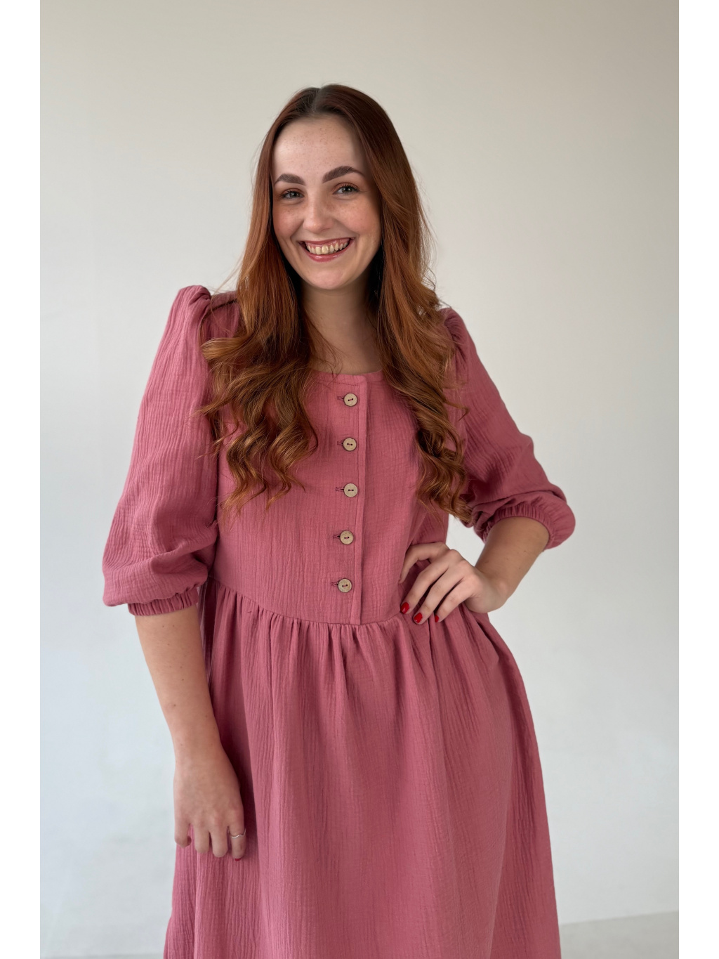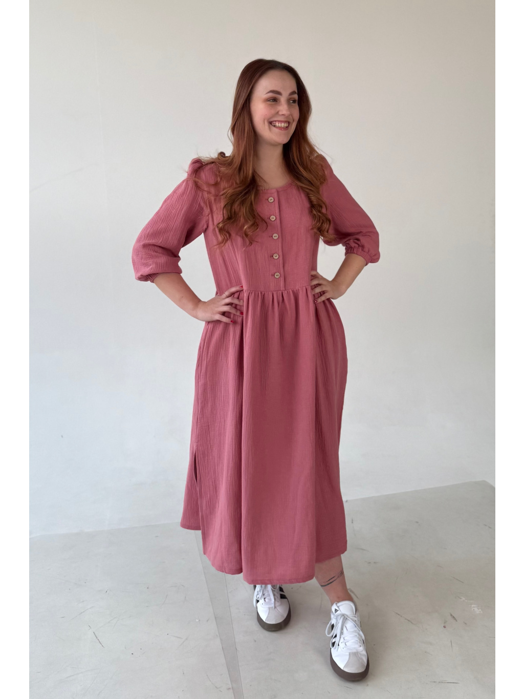 Jsou ušity z mušelínu, který je lehký, prodyšný a velmi příjemný na nošení. Díky pohodlnému střihu jsou ideální pro každodenní nošení. Na straně šatů najdete rozparek, který zajišťuje větší volnost při chůzi. Nezapomněli jsme ani na oblíbené kapsy.