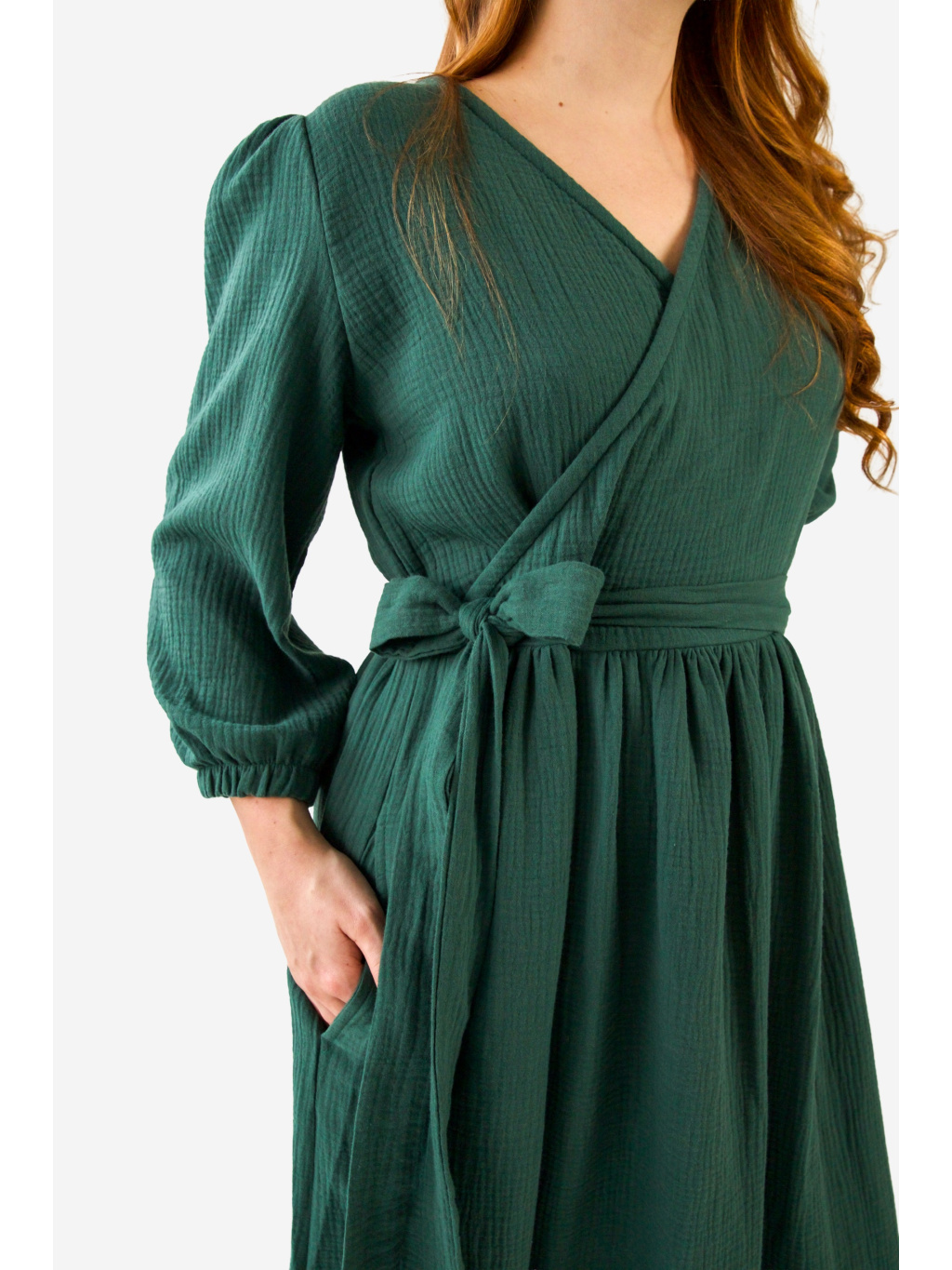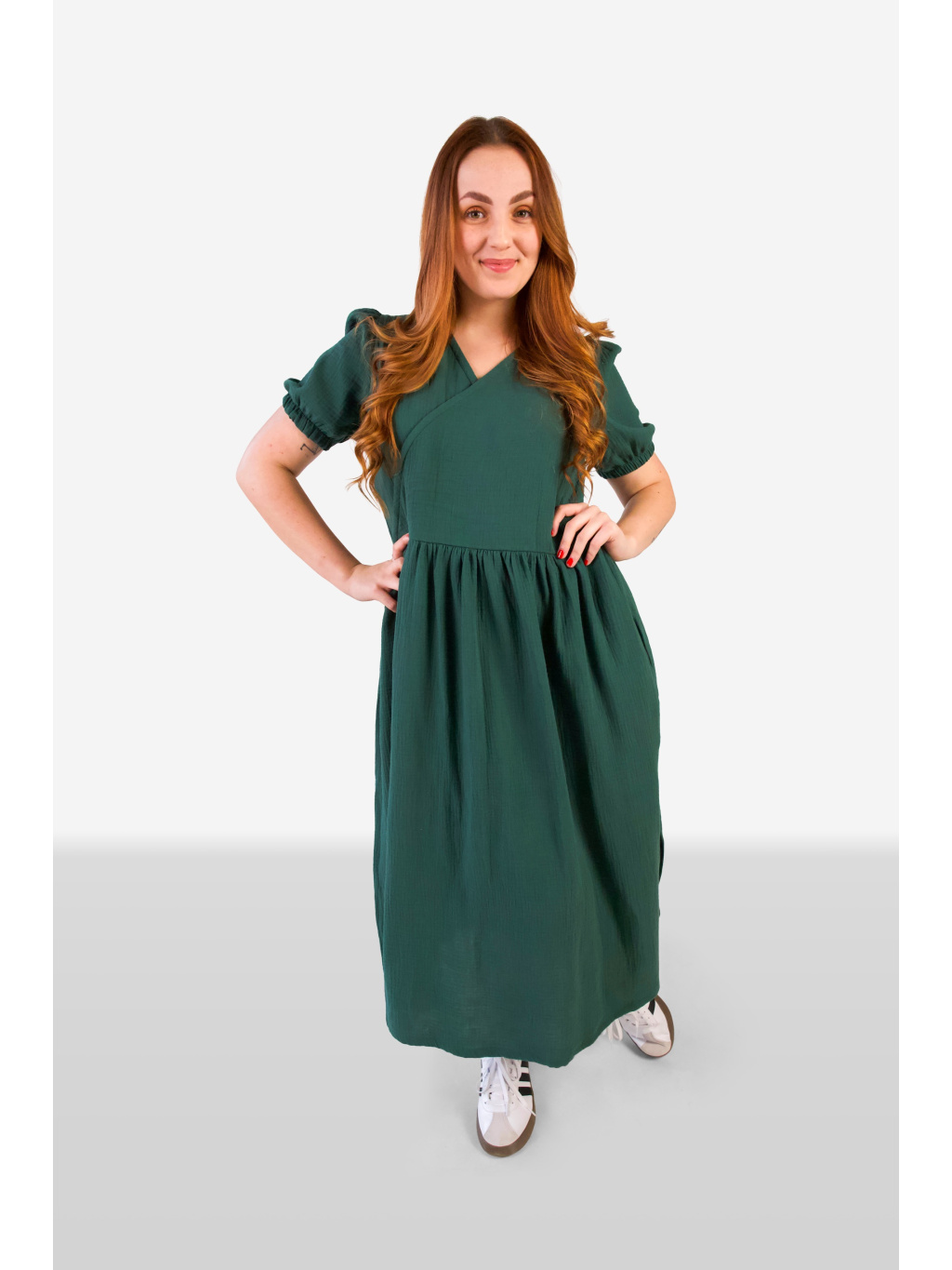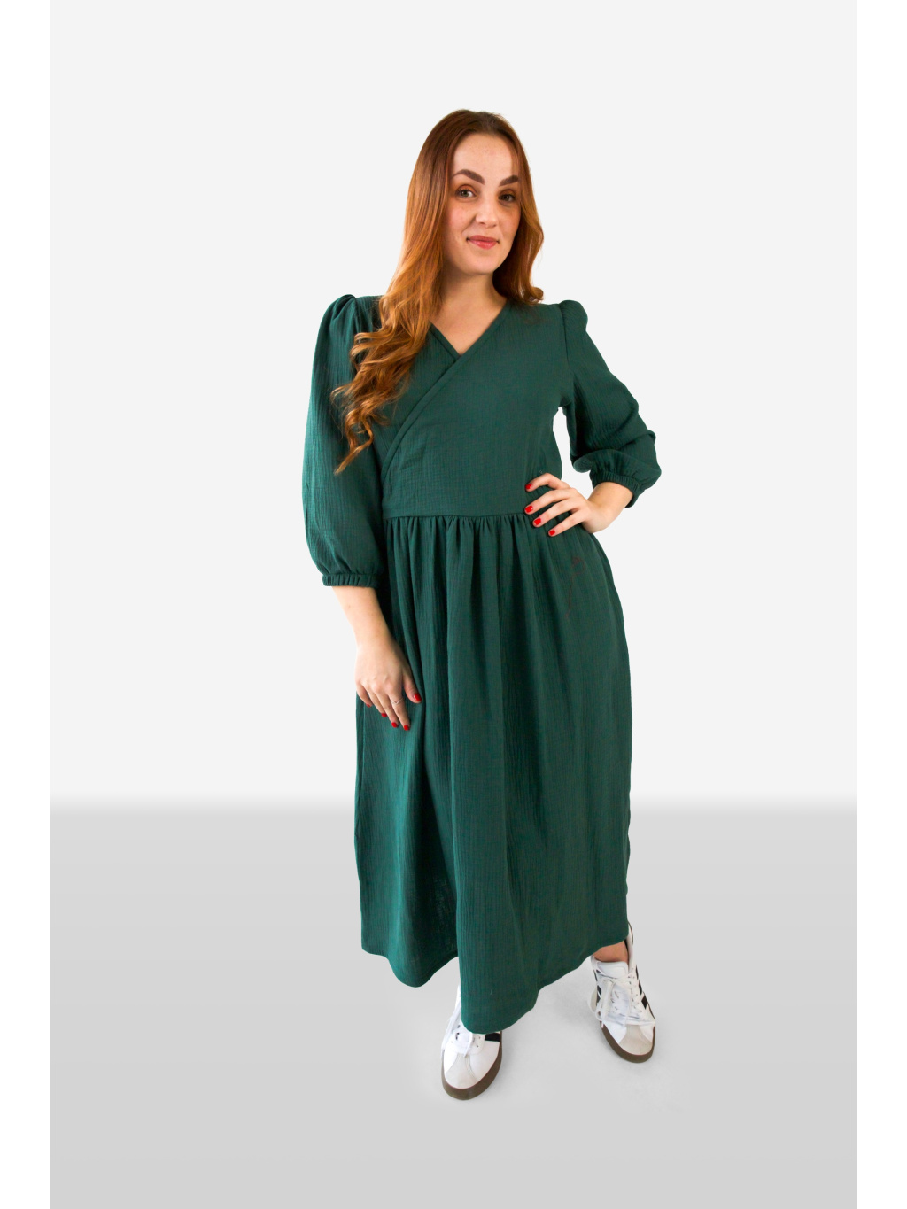Šaty mají jemně překřížený dekolt, který působí žensky a lichotivě zvýrazní horní část postavy. Rukávy jsou zakončené do gumičky, díky čemuž vytváří lehce nabíraný efekt a dodávají šatům uvolněný, přirozený vzhled.