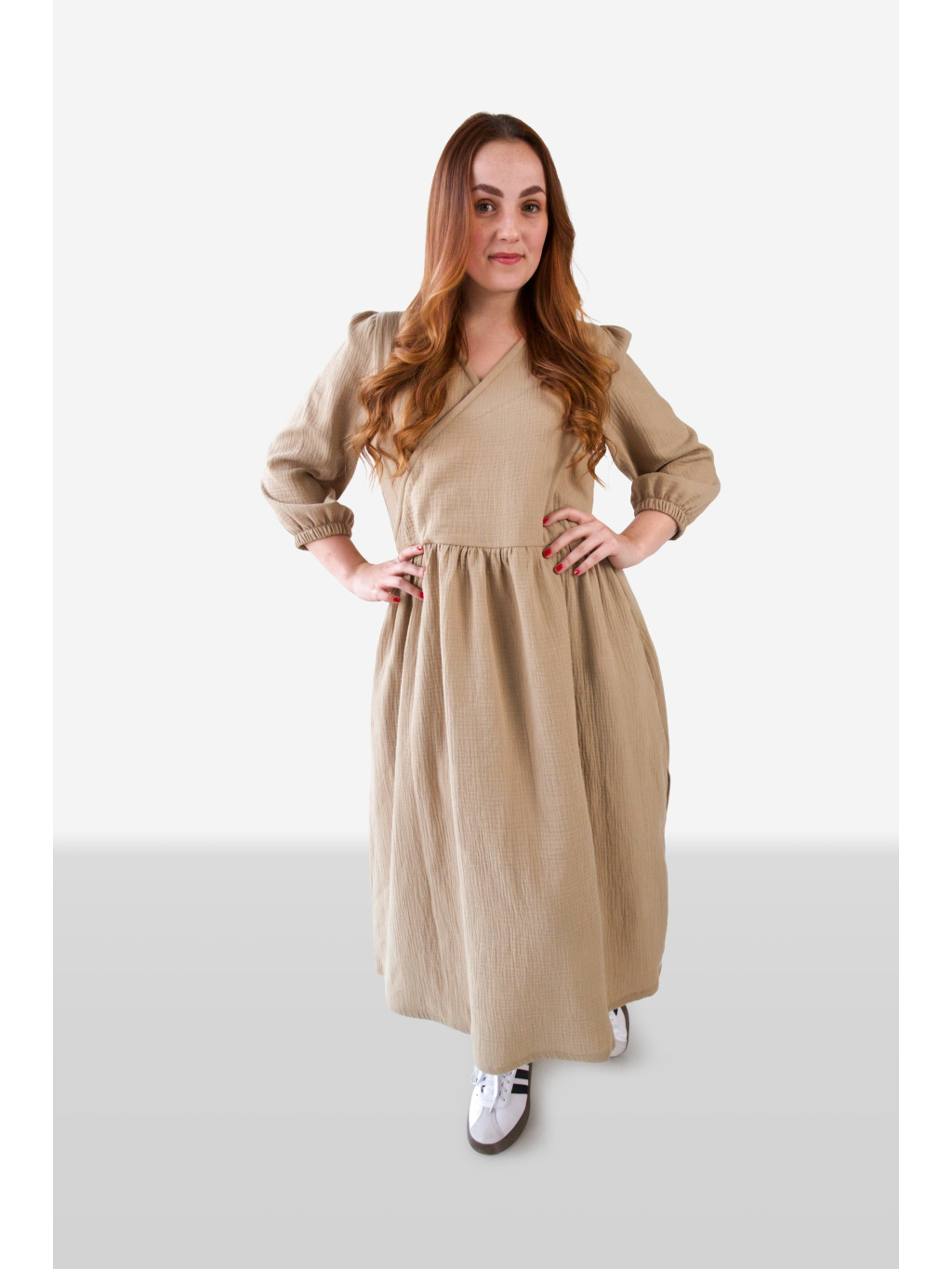 Šaty mají jemně překřížený dekolt, který působí žensky a lichotivě zvýrazní horní část postavy. Rukávy jsou zakončené do gumičky, díky čemuž vytváří lehce nabíraný efekt a dodávají šatům uvolněný, přirozený vzhled.