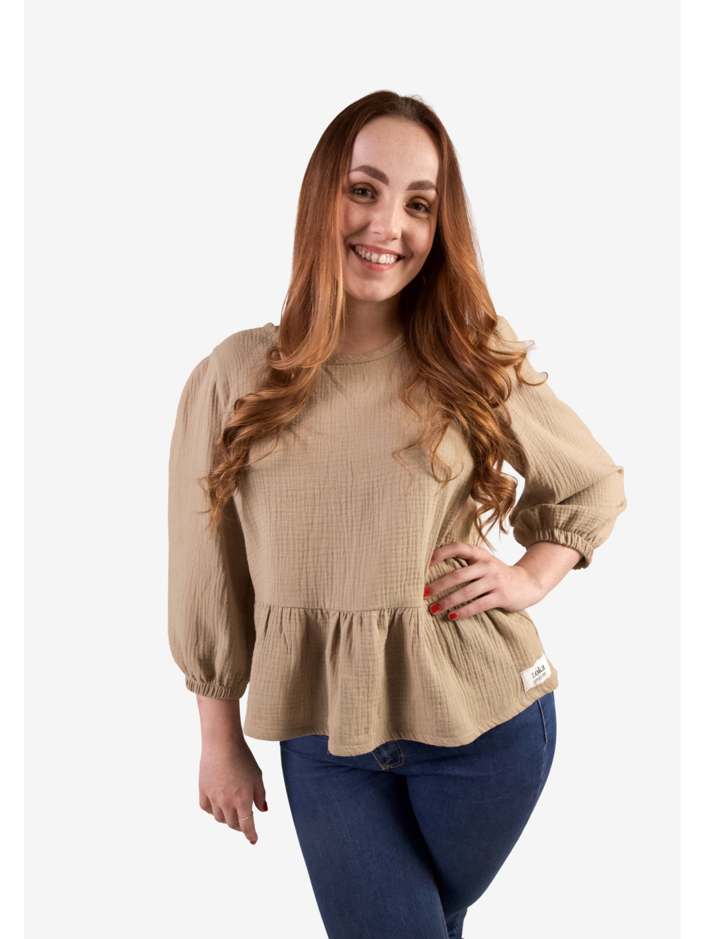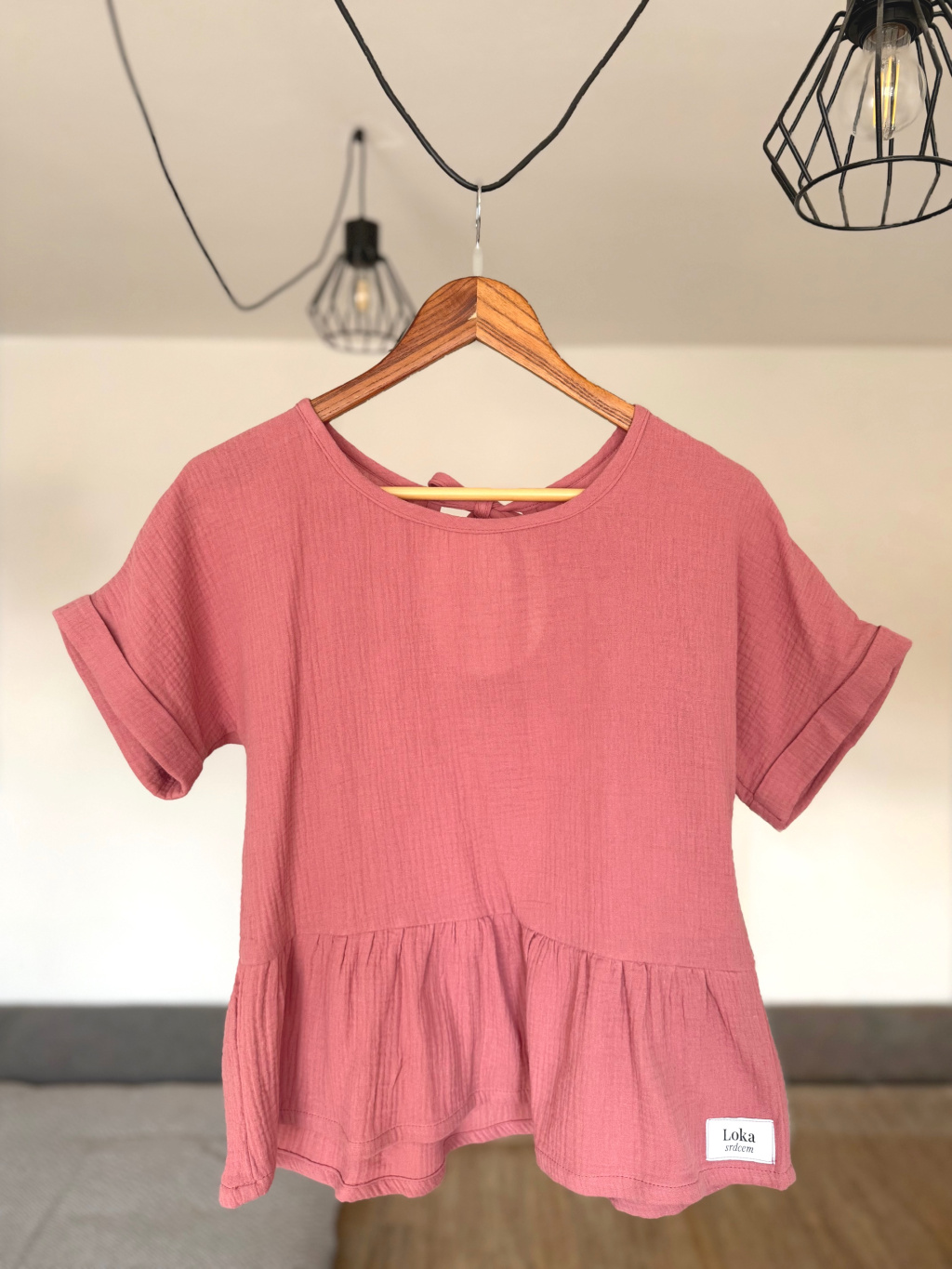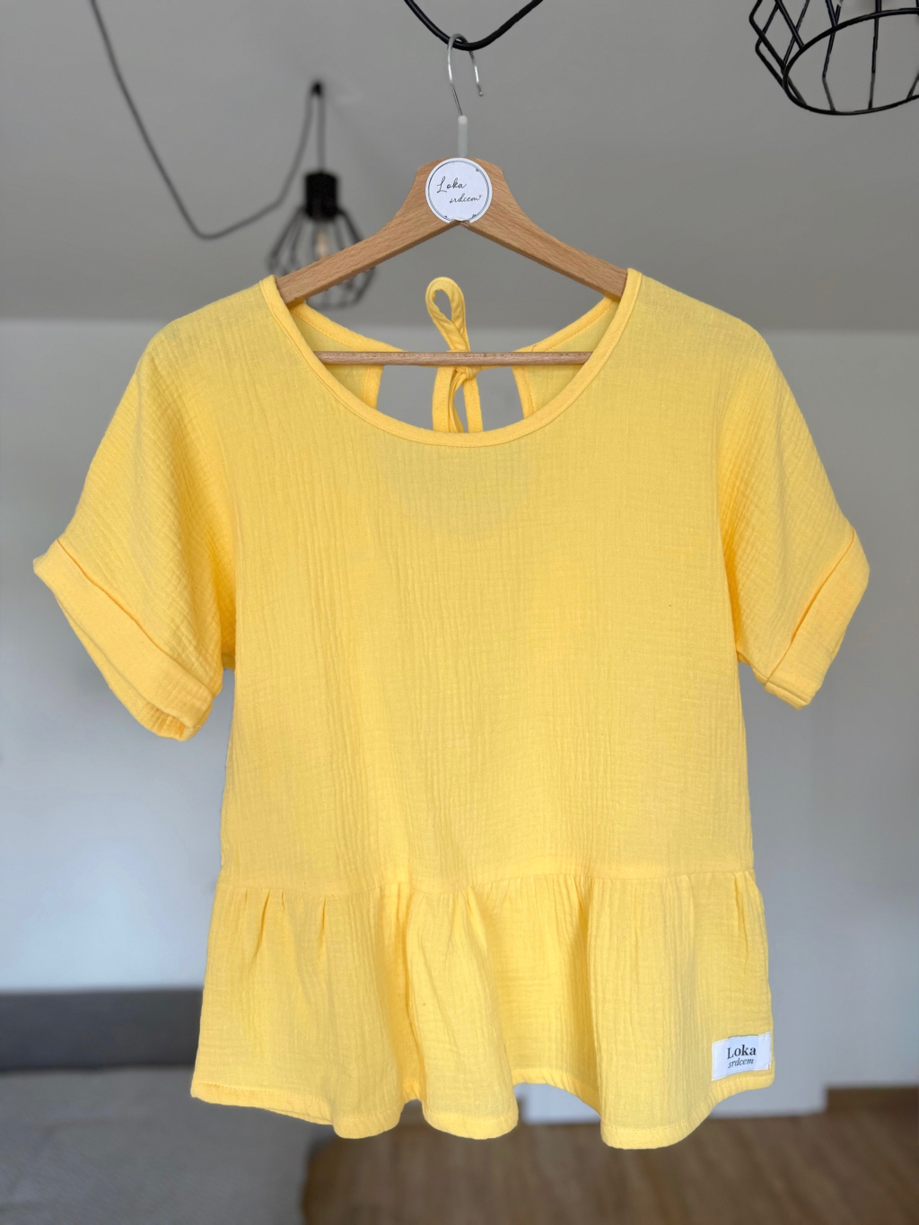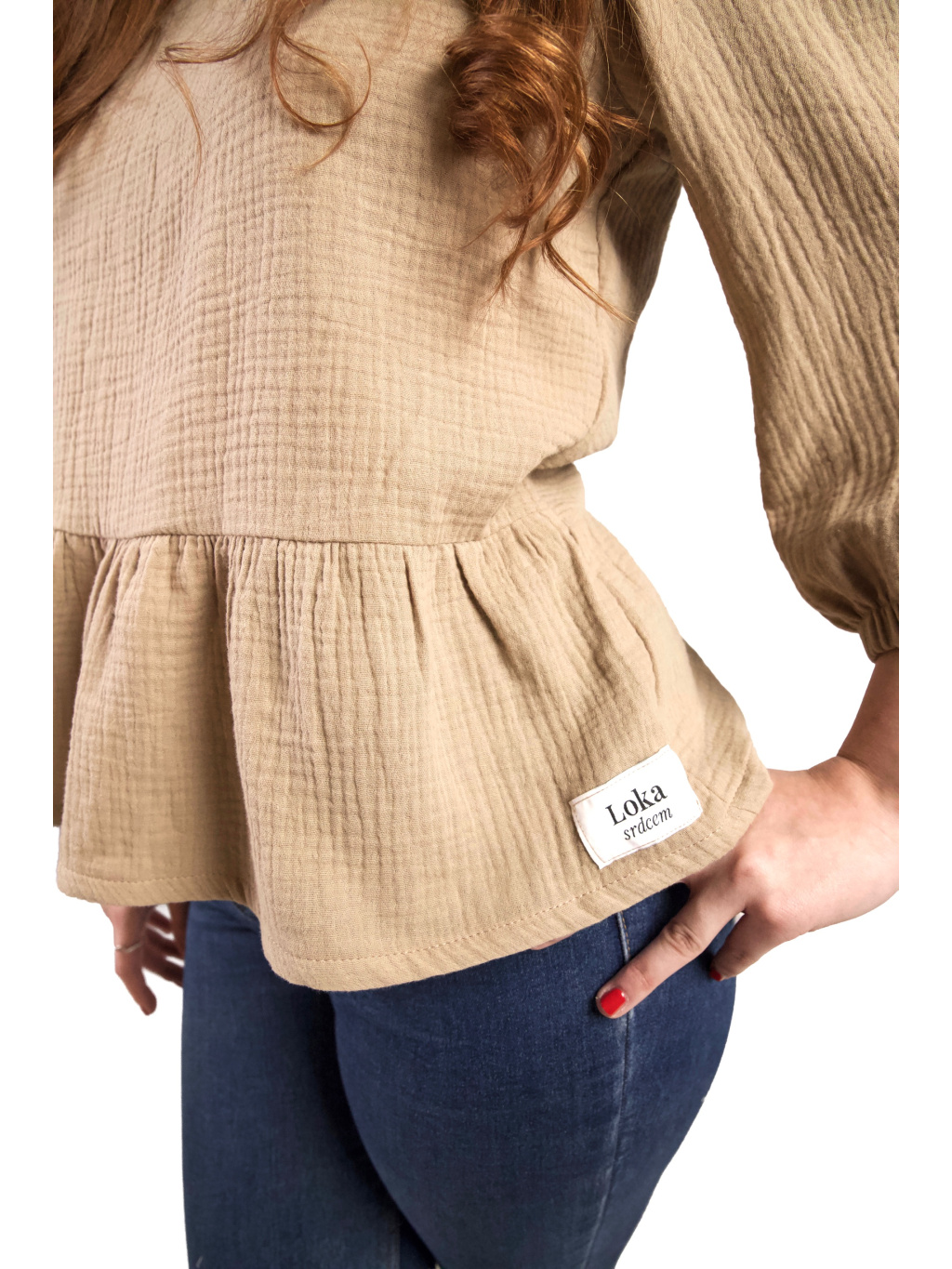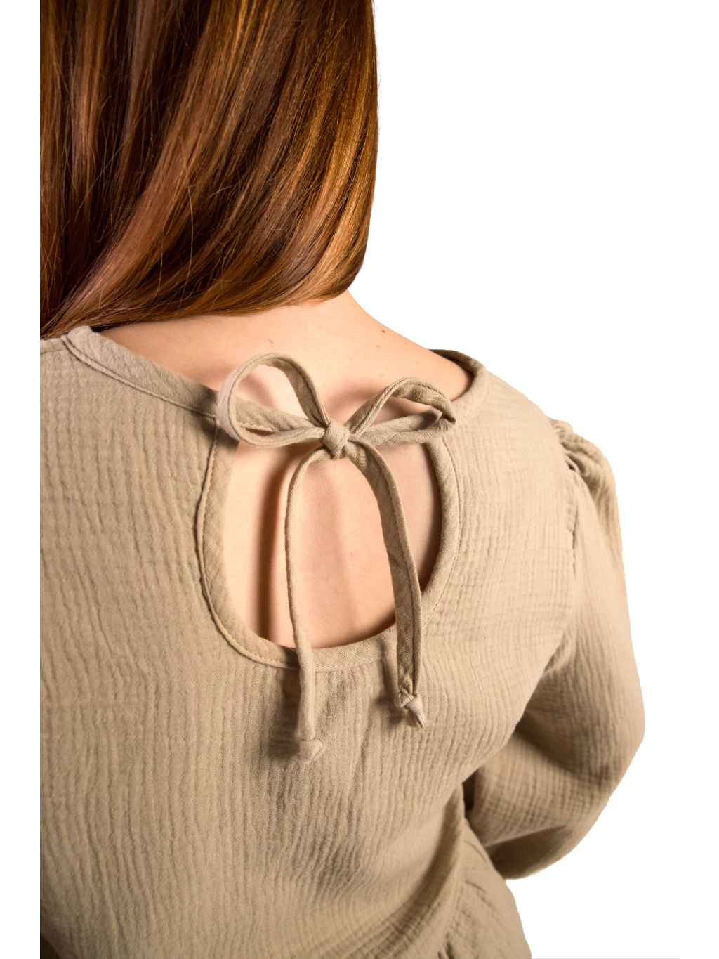 Top je ušitý ze 100% bavlněného mušelínu – materiálu, který je přirozeně lehký, prodyšný a velmi příjemný na nošení po celý den. Měkká struktura látky se přirozeně přizpůsobuje pohybu těla a vytváří pocit lehkosti.