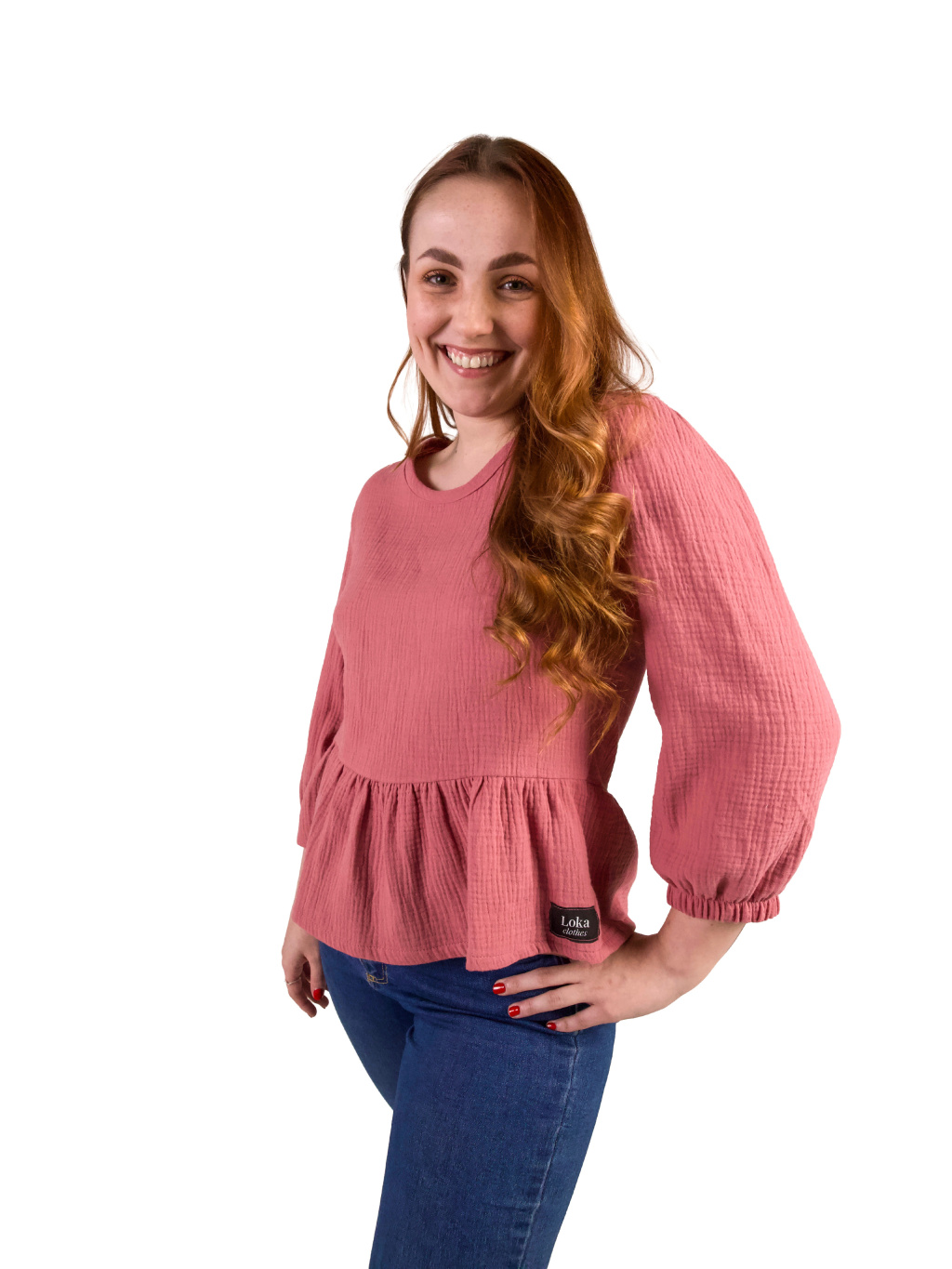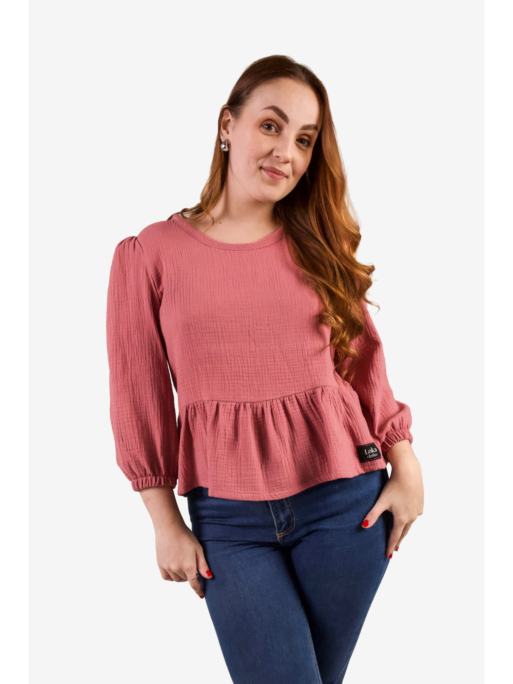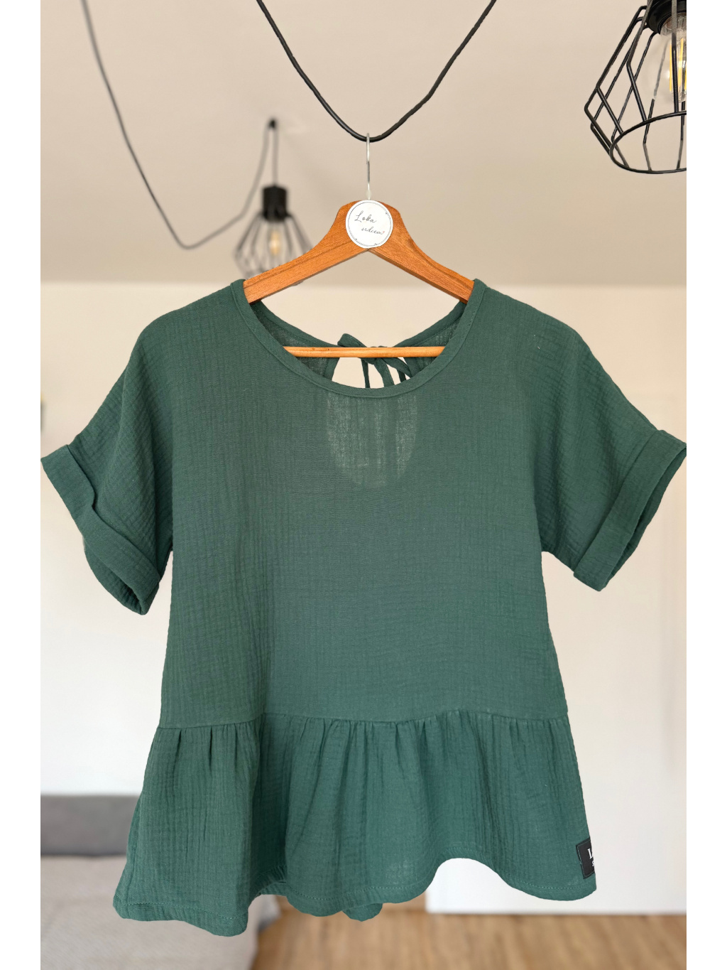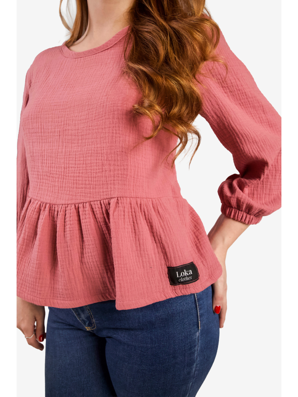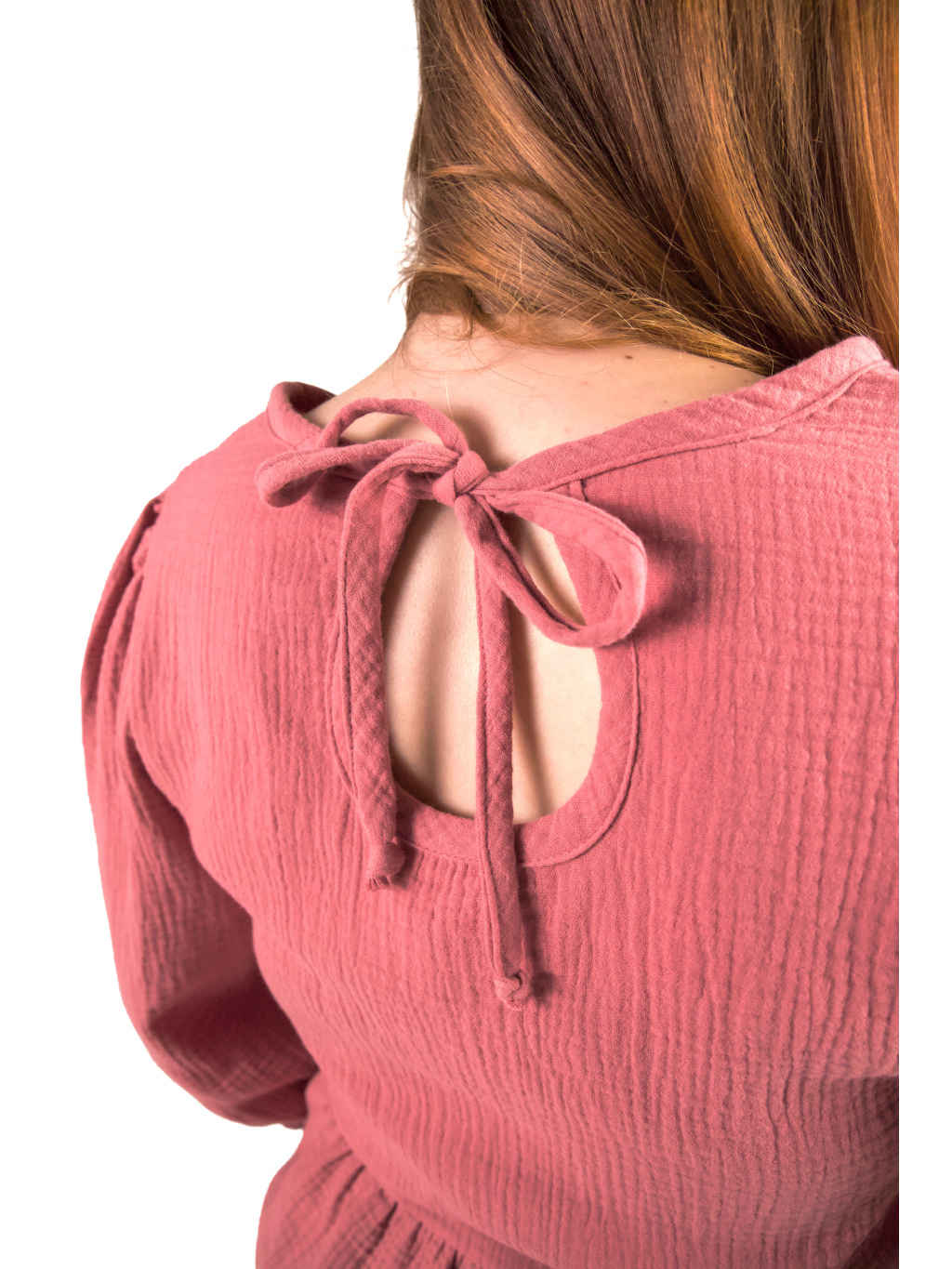 Top je ušitý ze 100% bavlněného mušelínu – materiálu, který je přirozeně lehký, prodyšný a velmi příjemný na nošení po celý den. Měkká struktura látky se přirozeně přizpůsobuje pohybu těla a vytváří pocit lehkosti.