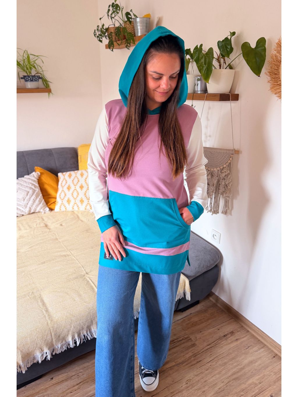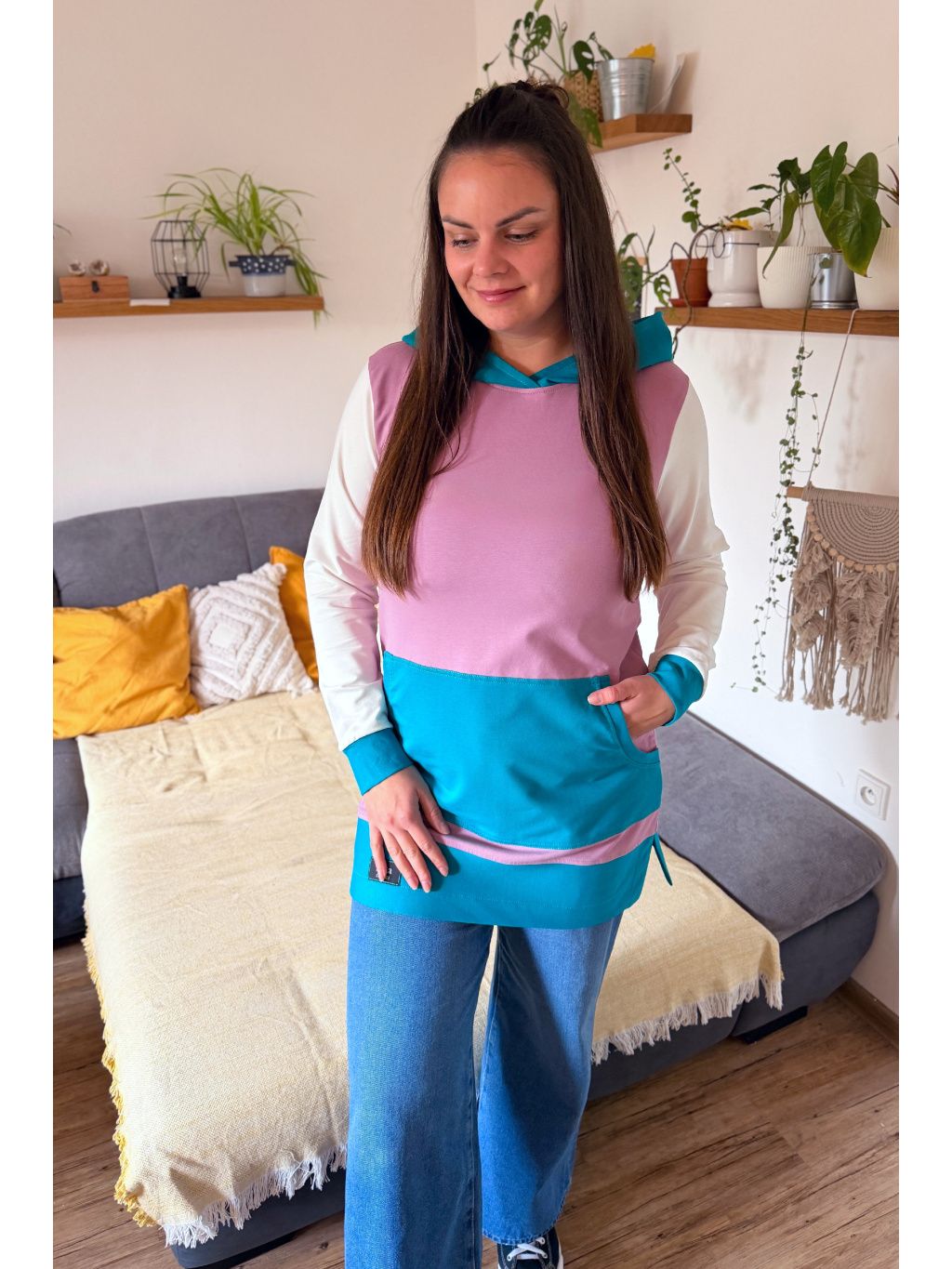 Tuto prodlouženou mikinu jsme ušili z tenké teplákoviny. Má prostornou klokaní kapsu, kapuci a rozparky po stranách, nebude Vás tedy omezovat v pohybu. Využijete ji během celého roku