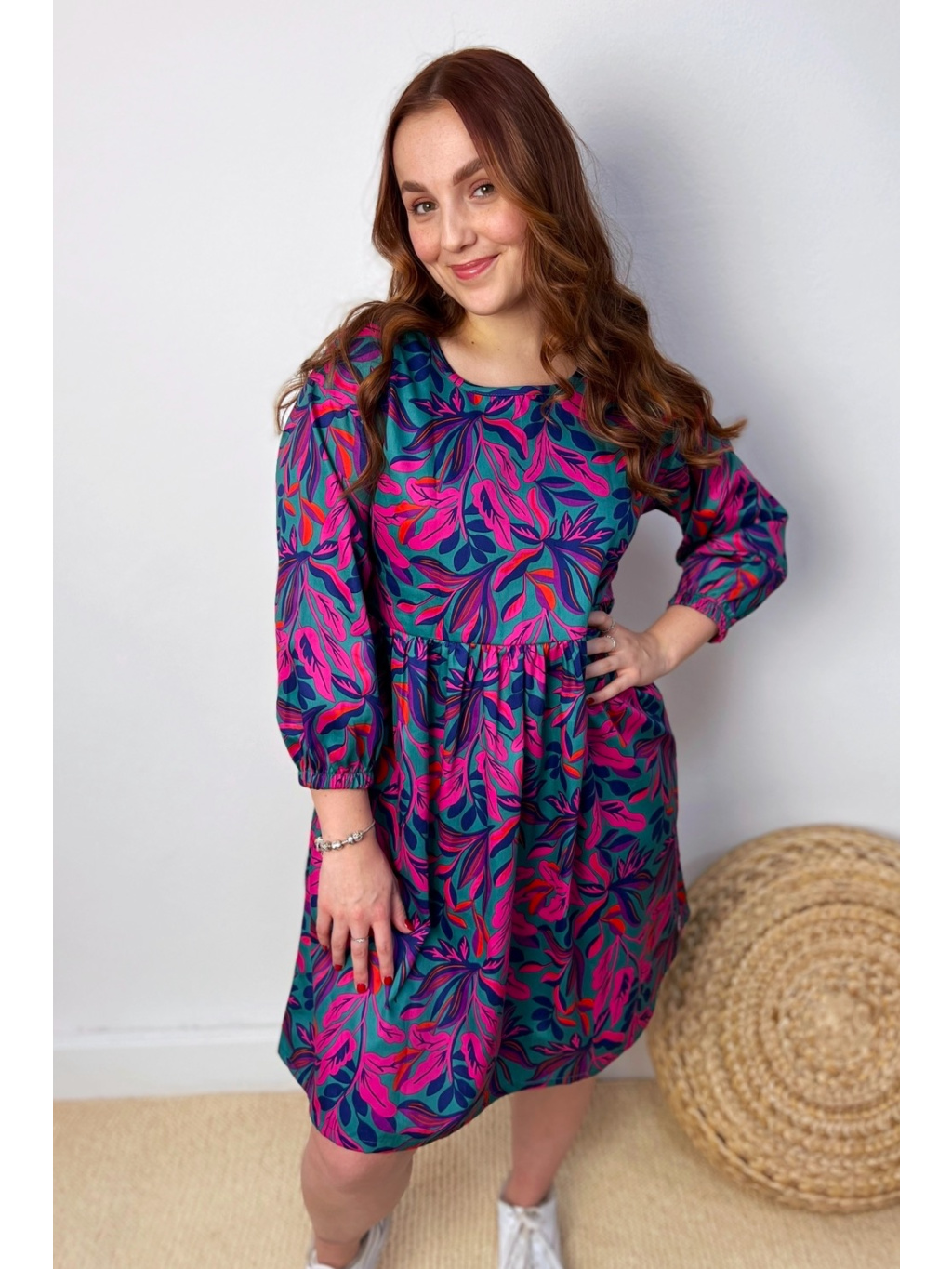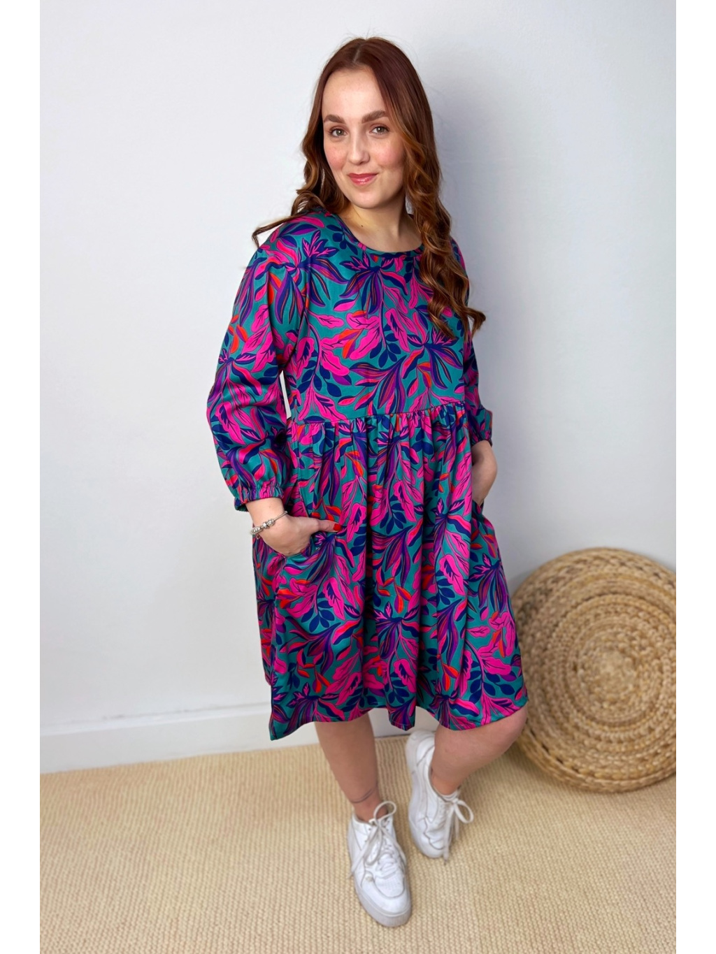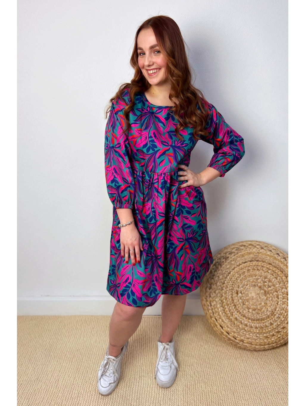 Šaty jsou ušity z lehoučkého bavlněného saténu. Rukáv je zakončen gumičkou a mají také kapsy.