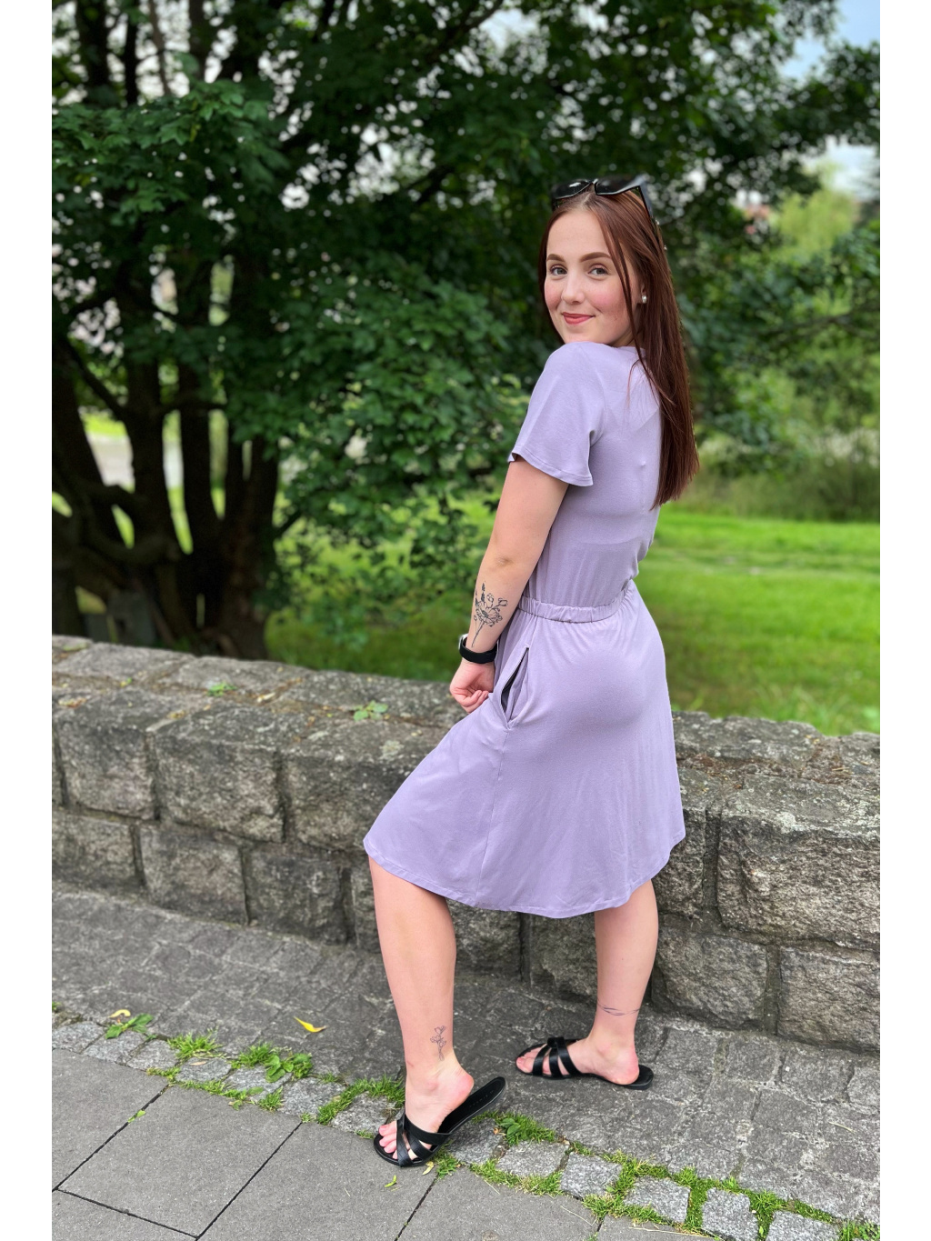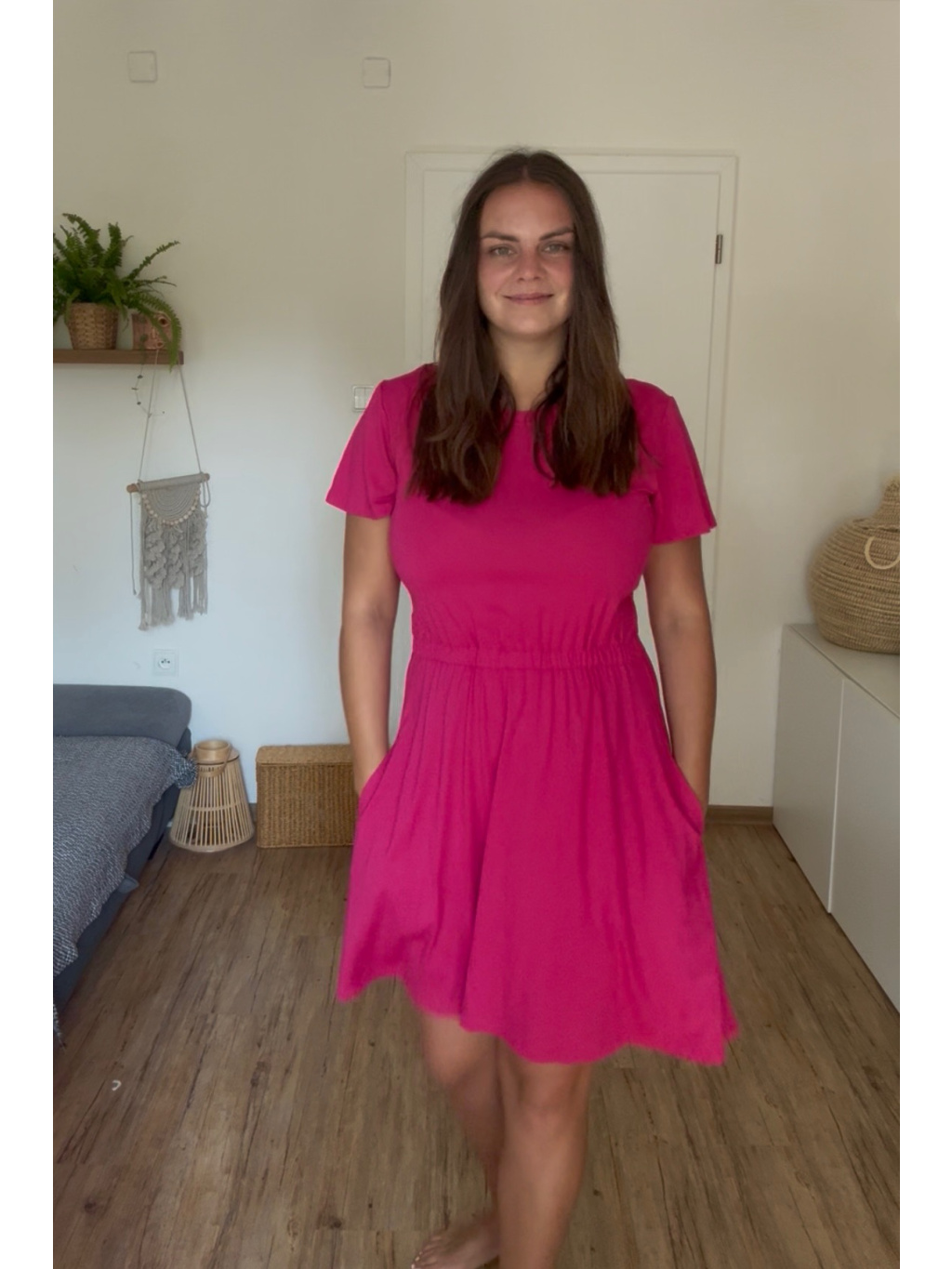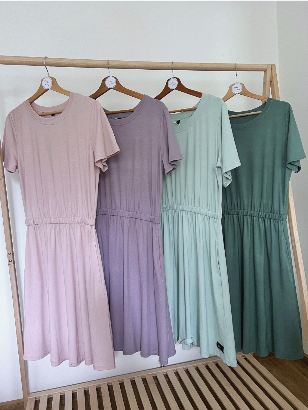 Šaty mají volnější střih, krátké rukávy a praktické kapsy po stranách, které dodávají na funkčnosti. Díky jednoduchému designu a jemným pastelovým barvám působí svěže, žensky a univerzálně – hodí se jak na doma, do města, tak i na lehčí letní výlety.