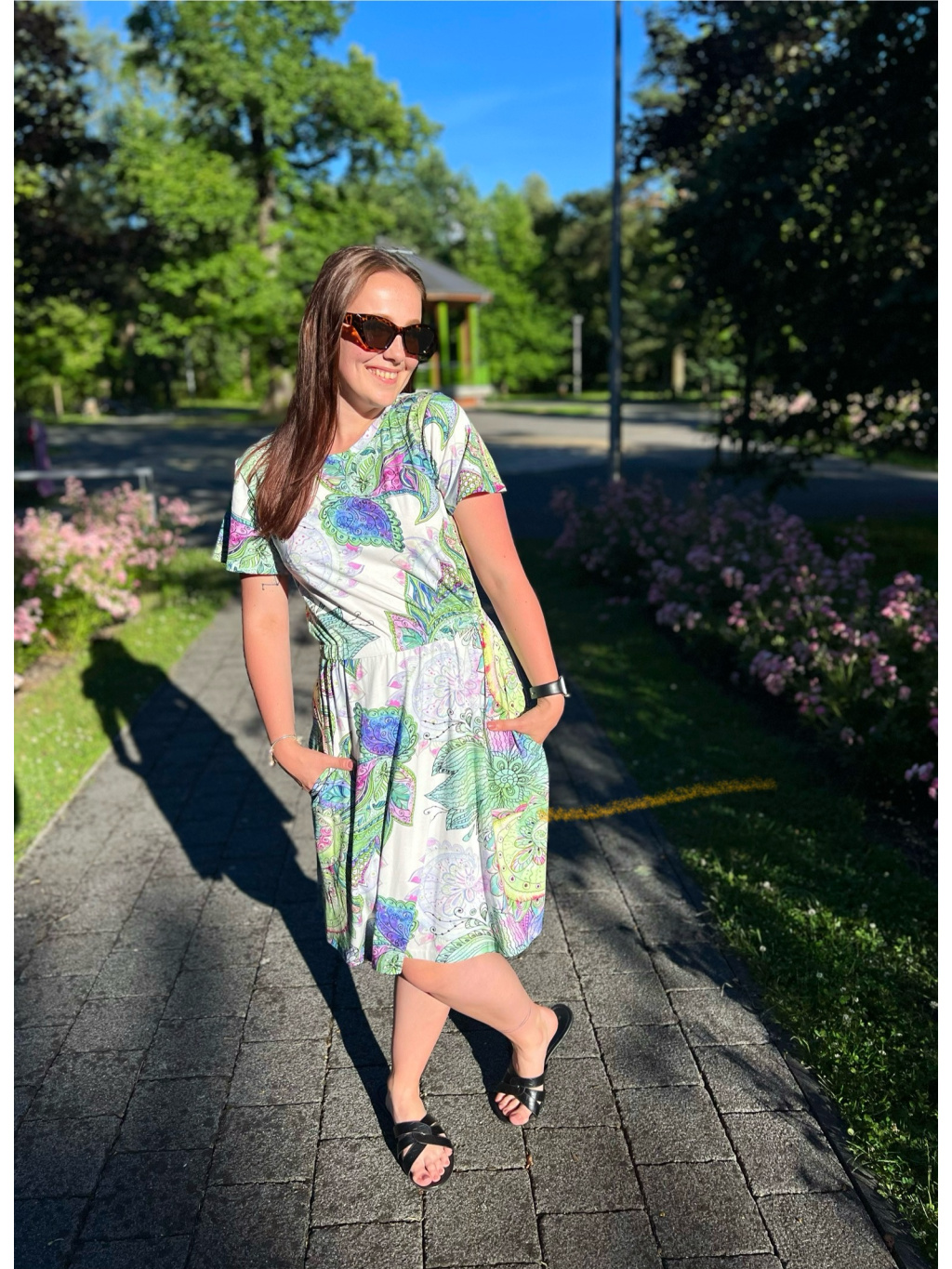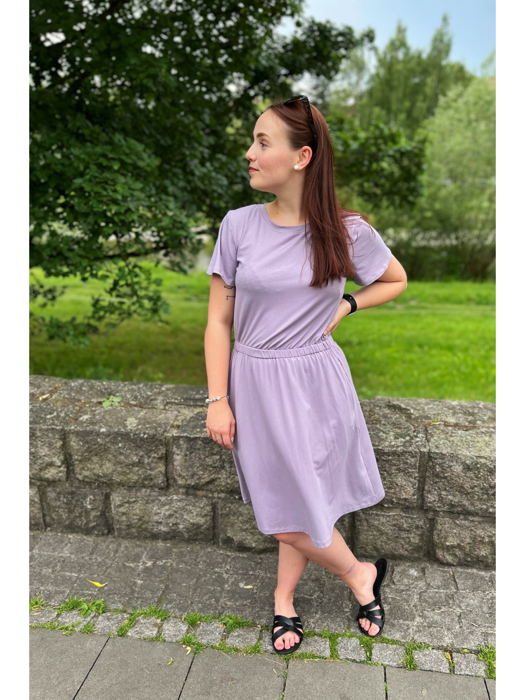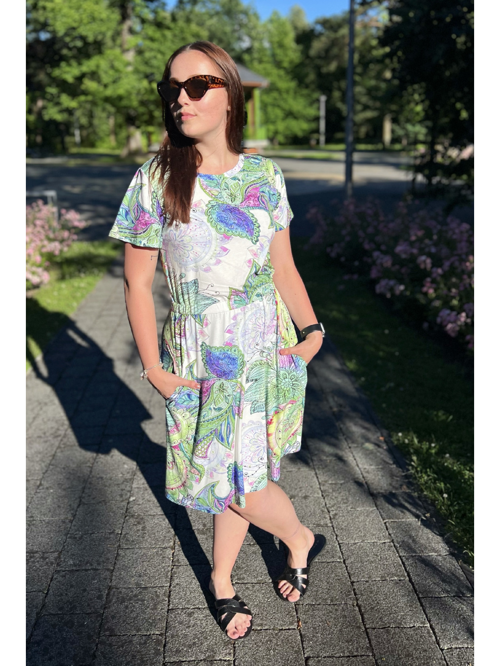 Šaty mají volnější střih, krátké rukávy a praktické kapsy po stranách, které dodávají na funkčnosti. Díky jednoduchému designu a jemným pastelovým barvám působí svěže, žensky a univerzálně – hodí se jak na doma, do města, tak i na lehčí letní výlety.