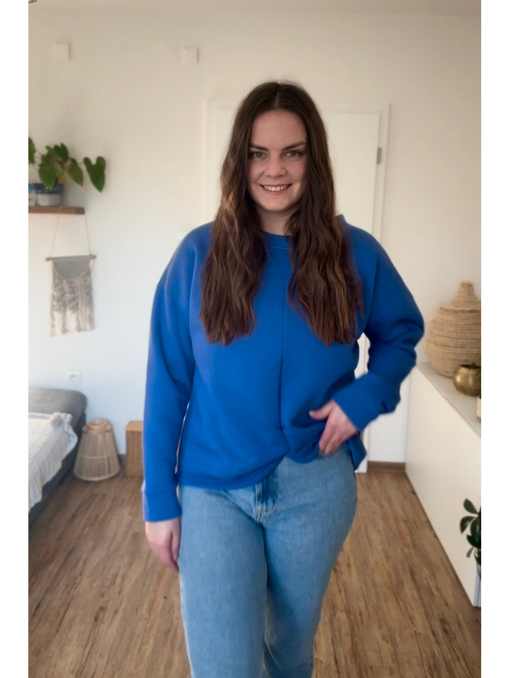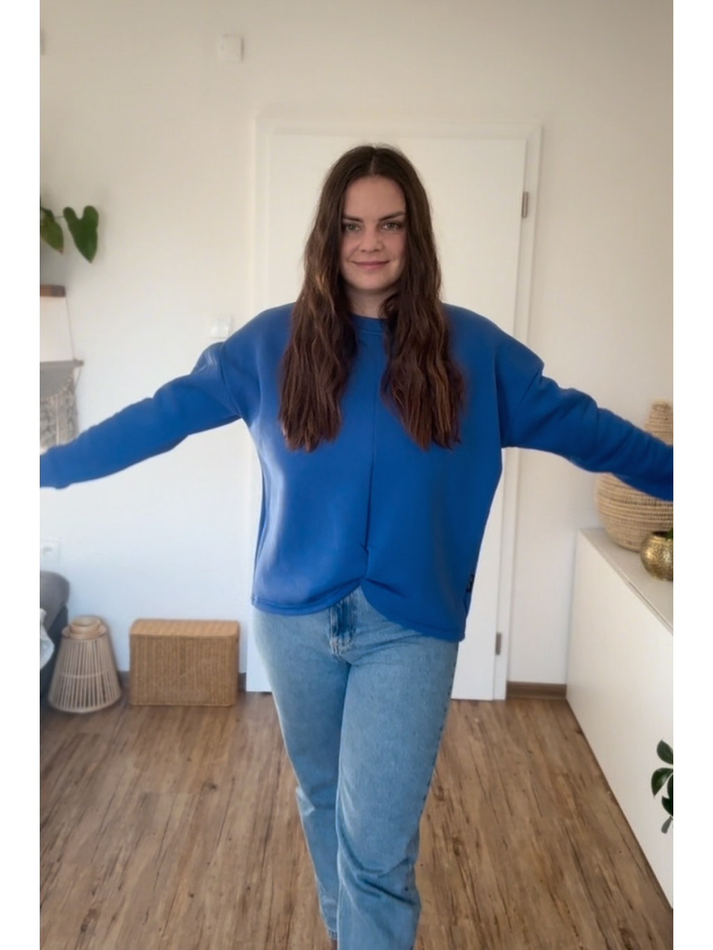 Střih zůstává pohodlný a lichotivý – přes prsa je volnější, směrem k pasu se lehce zužuje. Spadnuté rukávy a originální přední propletení dodávají mikině jedinečný charakter.