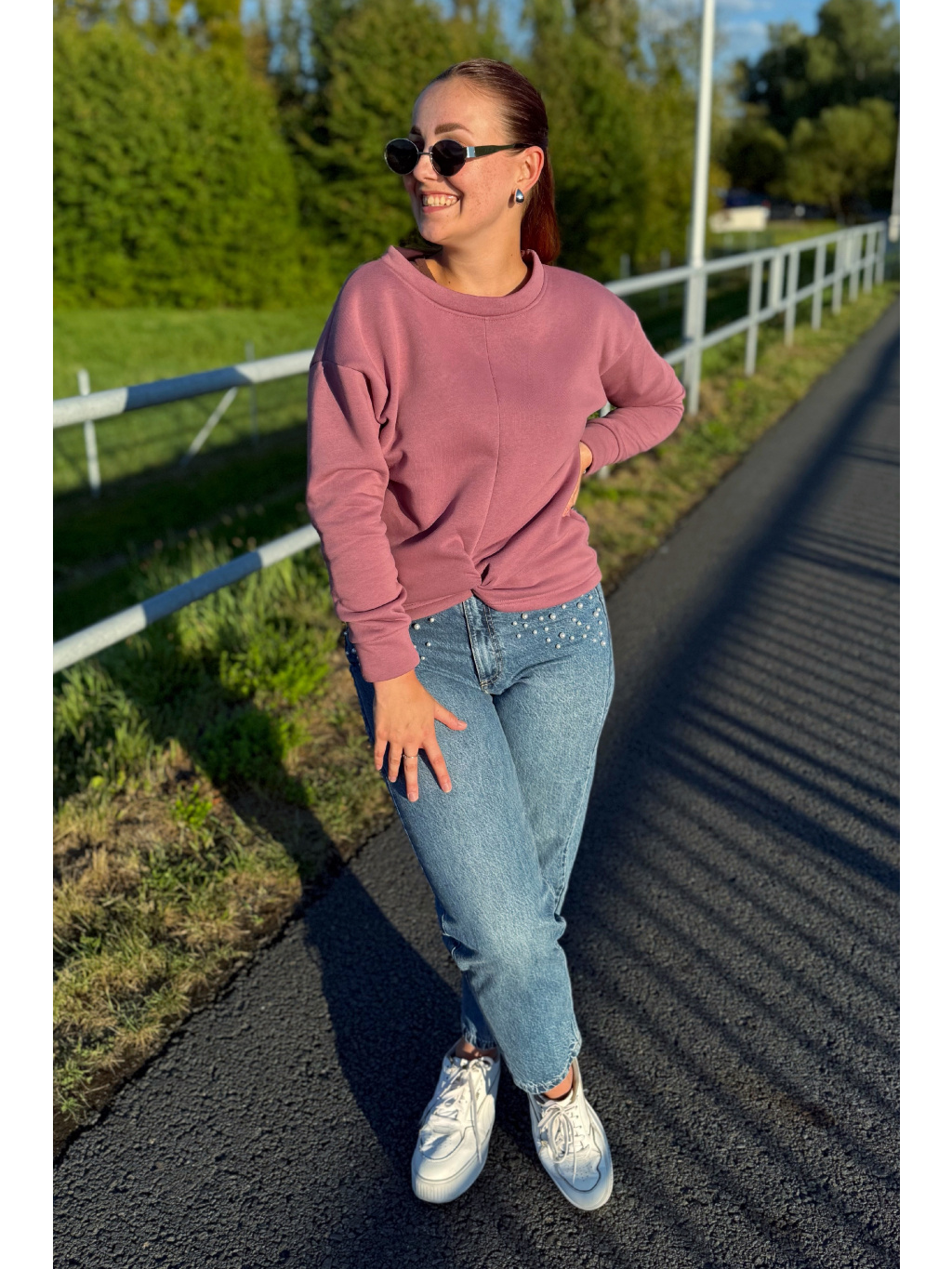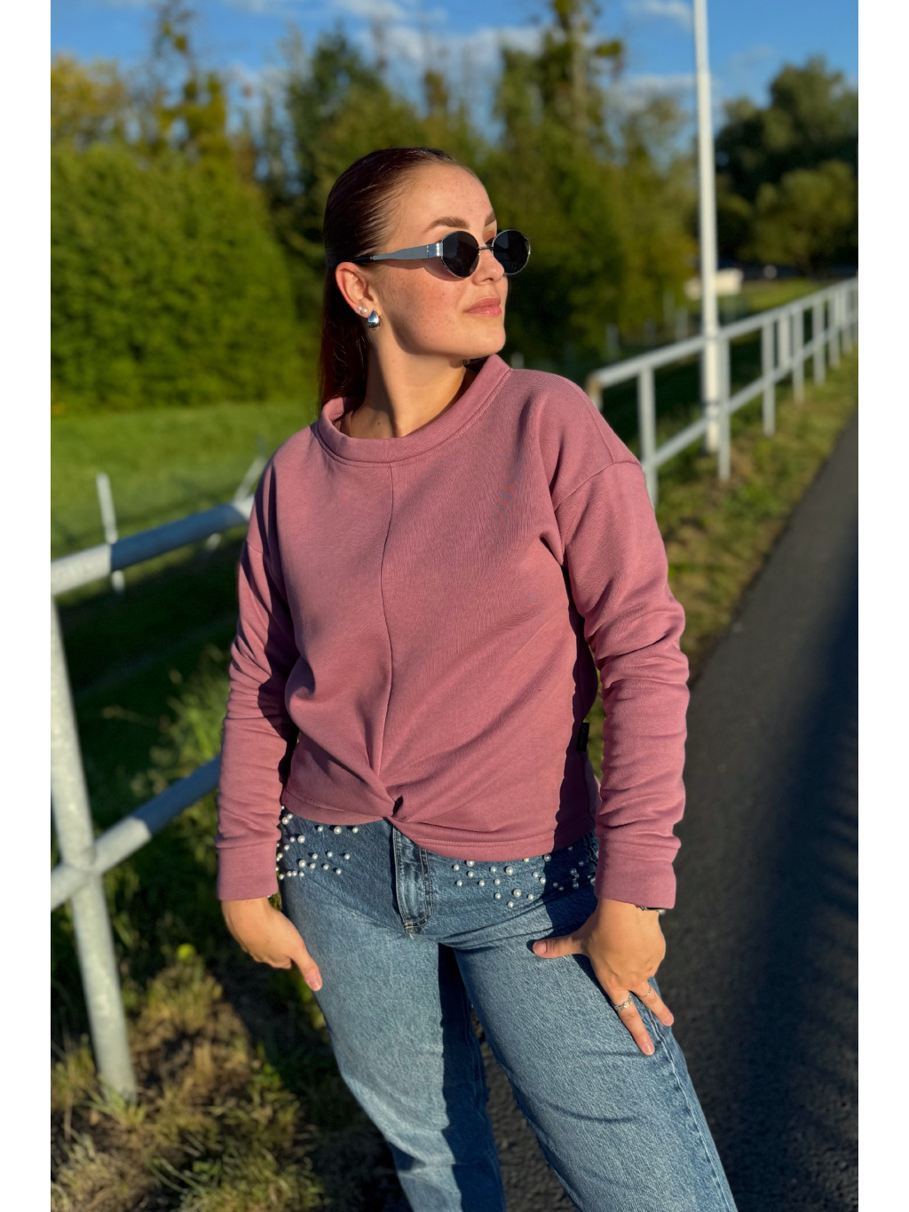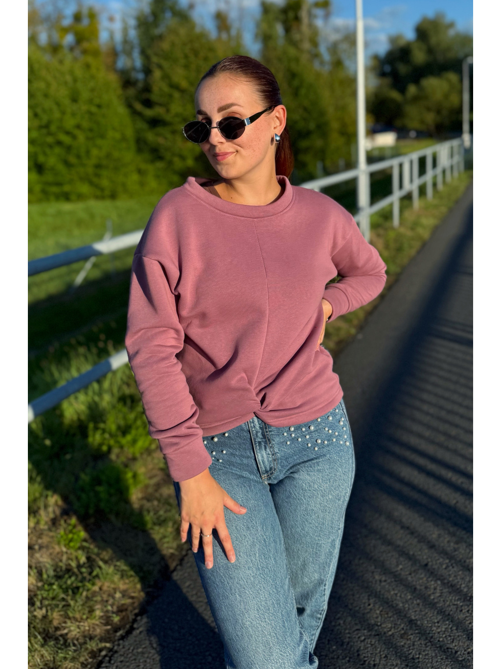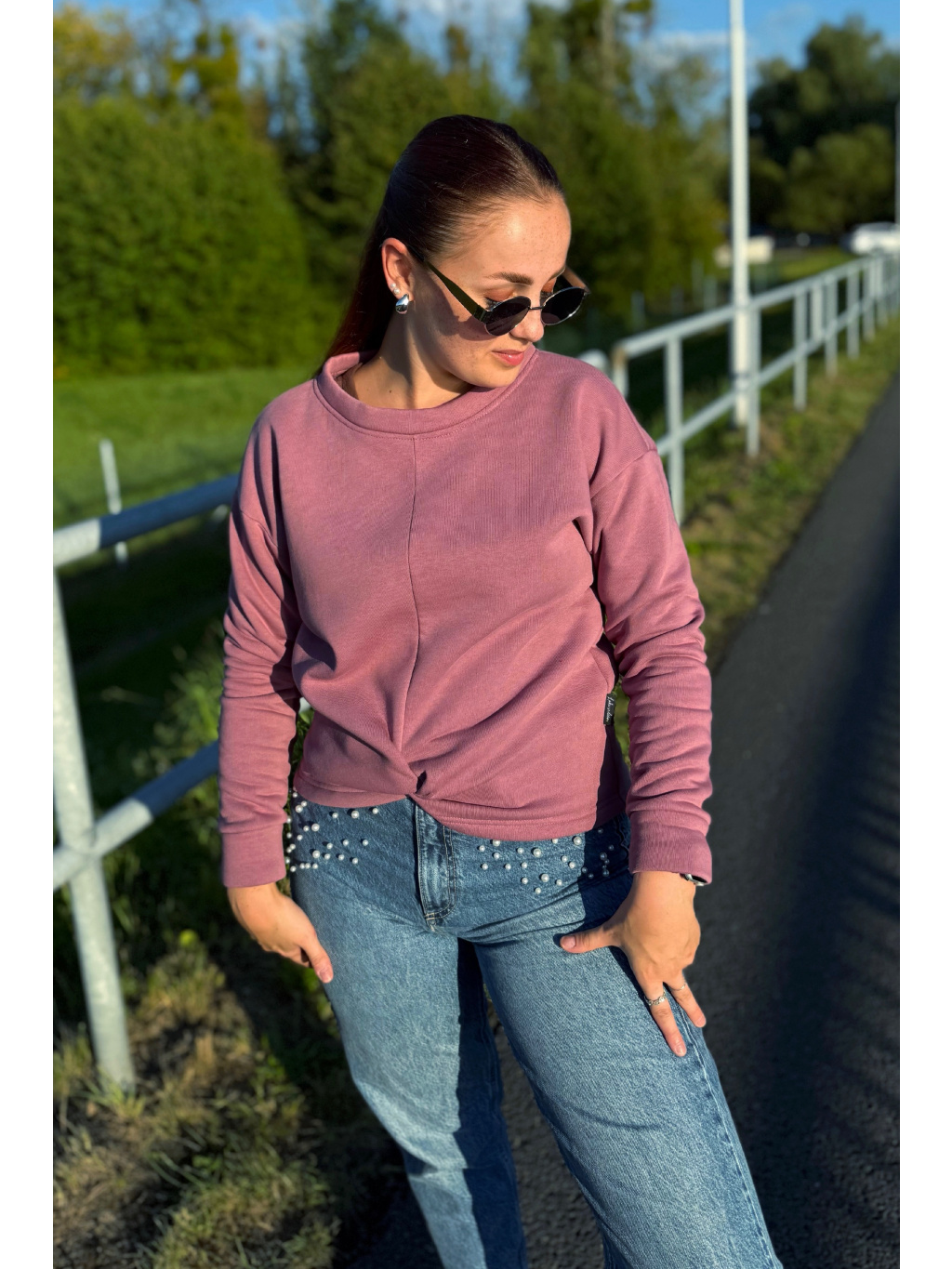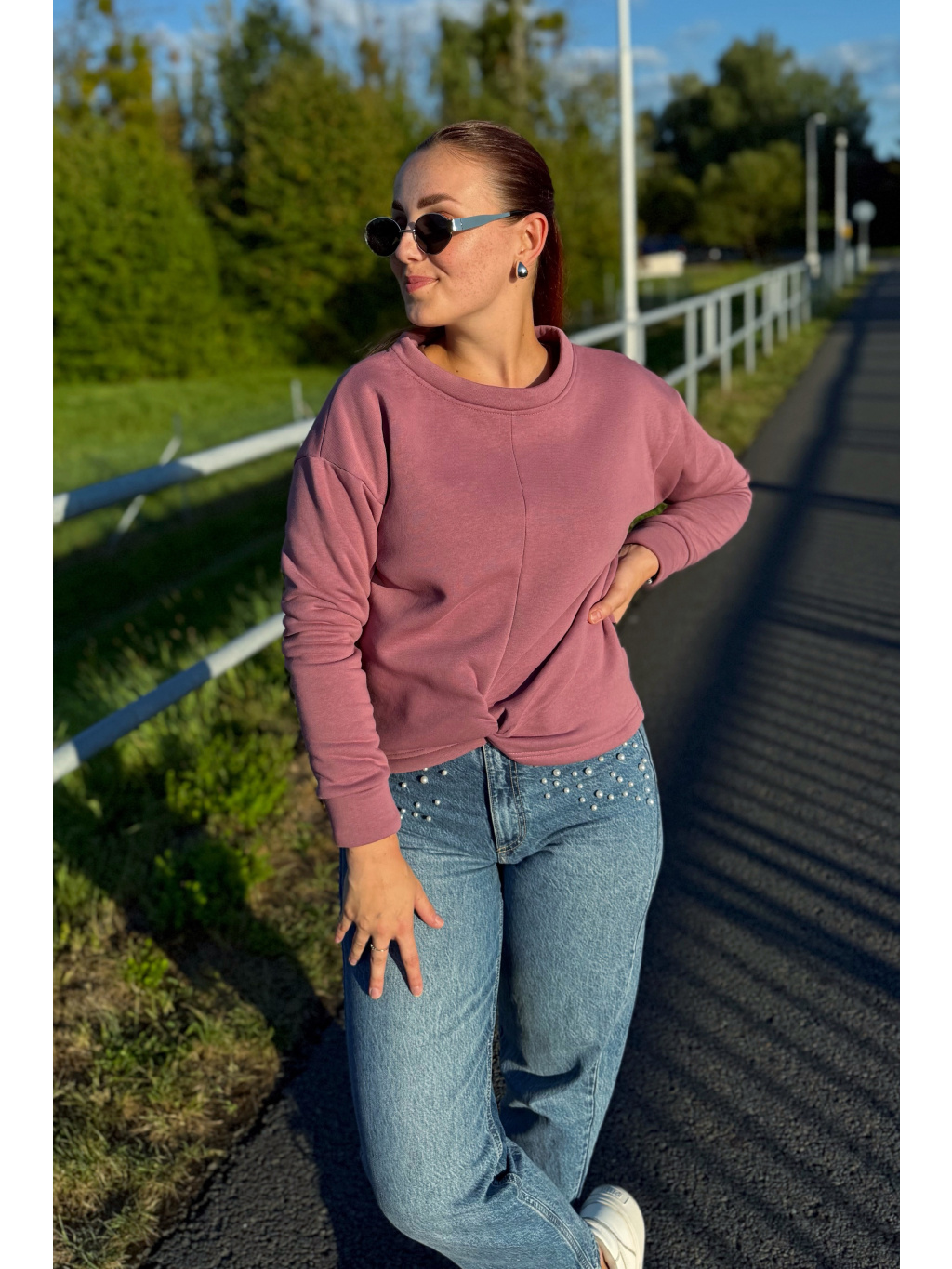 Střih zůstává pohodlný a lichotivý – přes prsa je volnější, směrem k pasu se lehce zužuje. Spadnuté rukávy a originální přední propletení dodávají mikině jedinečný charakter.
