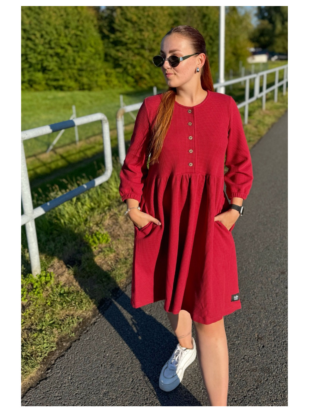 Šaty Anne jsou synonymem každodenního pohodlí. Měkký vaflový úplet s jemnou strukturou se krásně přizpůsobí postavě i pohybu. Rukávy jsou 3/4 s volnou gumičkou, praktické kapsy přinášejí pocit svobody a funkčnost v jednom. Rády Vám je ušijeme také s dlouhým rukávem, stačí nám požadavek připsat do poznámky k objednávce.